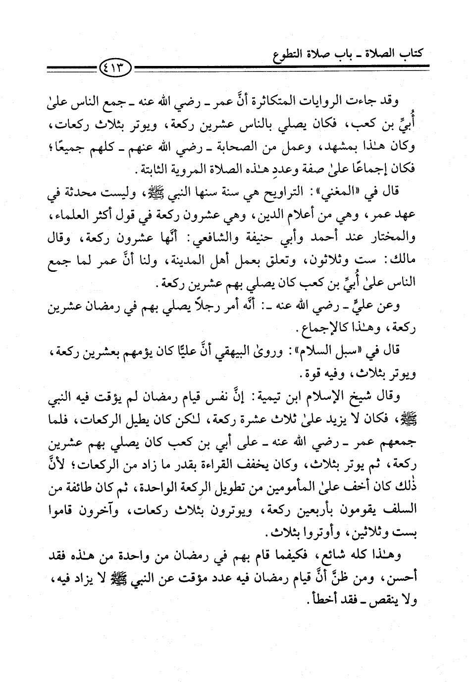 وقال شيخ الإسلام ابن تيمية: إنَّ نفس قيام رمضان لم يؤقت فيه النبي -صلى الله عليه وسلم-، فكان لا يزيد على ثلاث عشرة ركعة، لكن كان يطيل الركعات، فلما جمعهم عمر -رضي الله عنه- على أبي بن كعب كان يصلي بهم عشرين ركعة، ثم يوتر بثلاث، وكان يخفف القراءة بقدر ما زاد من الركعات؛ لأنَّ ذلك كان أخف على المأمومين من تطويل الركعة الواحدة، ثم كان طائفة من السلف يقومون بأربعين ركعة، ويوترون بثلاث ركعات، وآخرون قاموا بست وثلاثين، وأوتروا بثلاث.