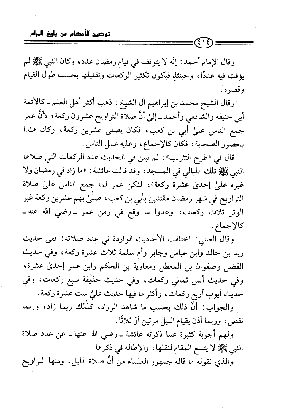 وقال الشيخ محمد بن إبراهيم آل الشيخ: ذهب أكثر أهل العلم -كالأئمة أبي حنيفة والشافعي وأحمد- إلى أنَّ صلاة التراويح عشرون ركعة؛ لأنَّ عمر جمع الناس على أبي بن كعب، فكان يصلي عشرين ركعة، وكان هذا بحضور الصحابة، فكان كالإجماع، وعليه عمل الناس.