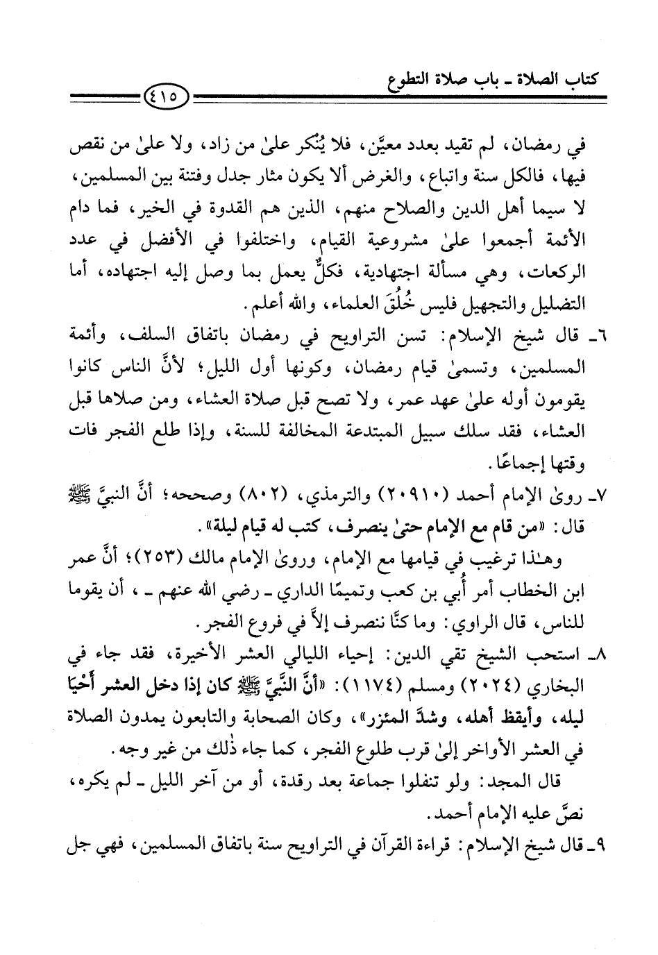 8 - استحب الشيخ تقي الدين: إحياء الليالي العشر الأخيرة، فقد جاء في البخاري (2024) ومسلم (1174): "أنَّ النَّبيَّ -صلى الله عليه وسلم- كان إذا دخل العشر أَحْيَا ليله، وأيقظ أهله، وشدَّ المئزر"، وكان الصحابة والتابعون يمدون الصلاة في العشر الأواخر إلى قرب طلوع الفجر، كما جاء ذلك من غير وجه.