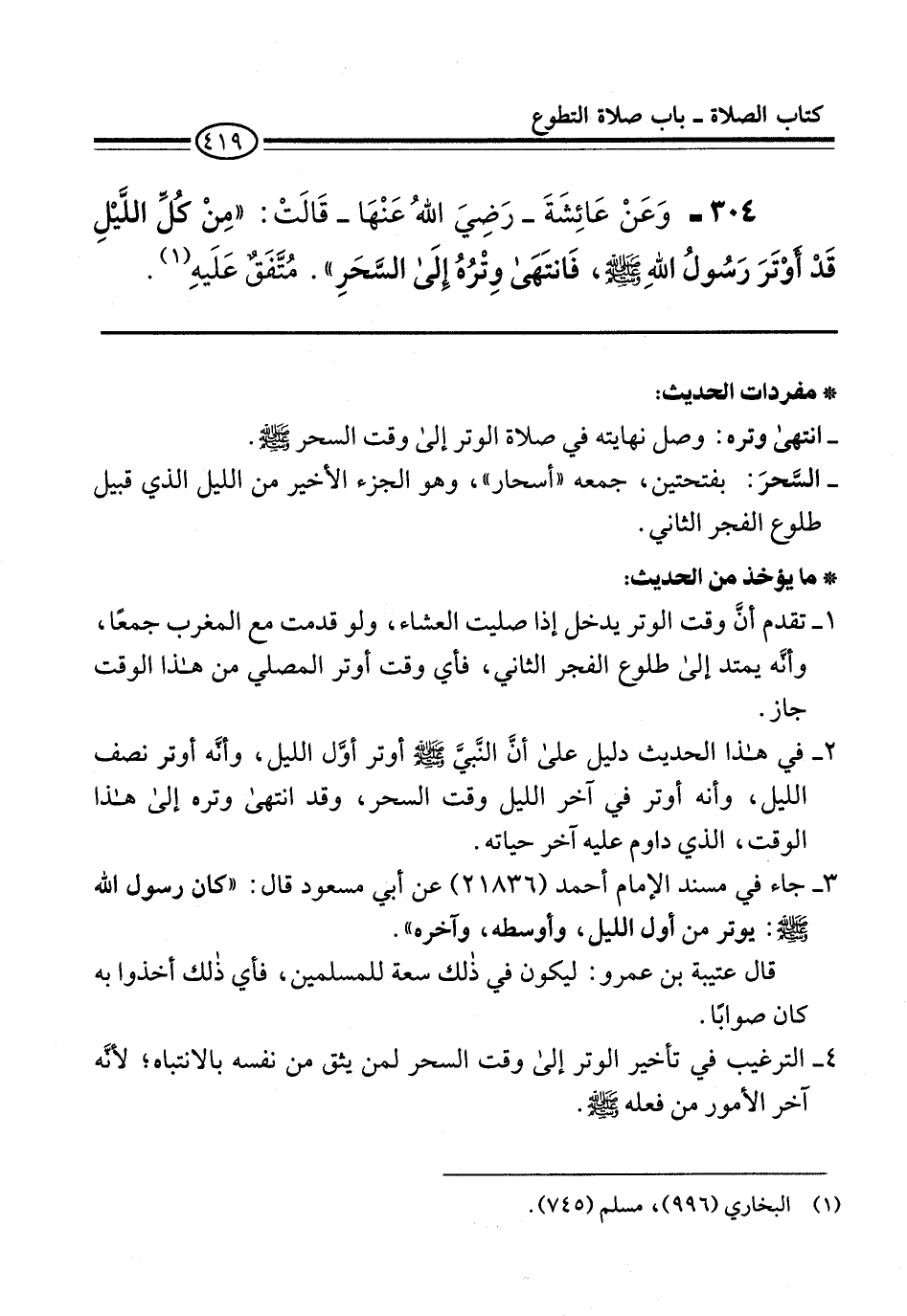 304 - وَعَنْ عَائِشَةَ -رَضِيَ اللهُ عَنْهَا- قَالَتْ: "مِنْ كُلِّ اللَّيْلِ قَدْ أوْتَرَ رَسُولُ اللهِ -صلى الله عليه وسلم-، فَانتَهَى وِتْرُهُ إلَى السَّحَرِ". مُتَّفَقٌ عَلَيهِ (¬1).