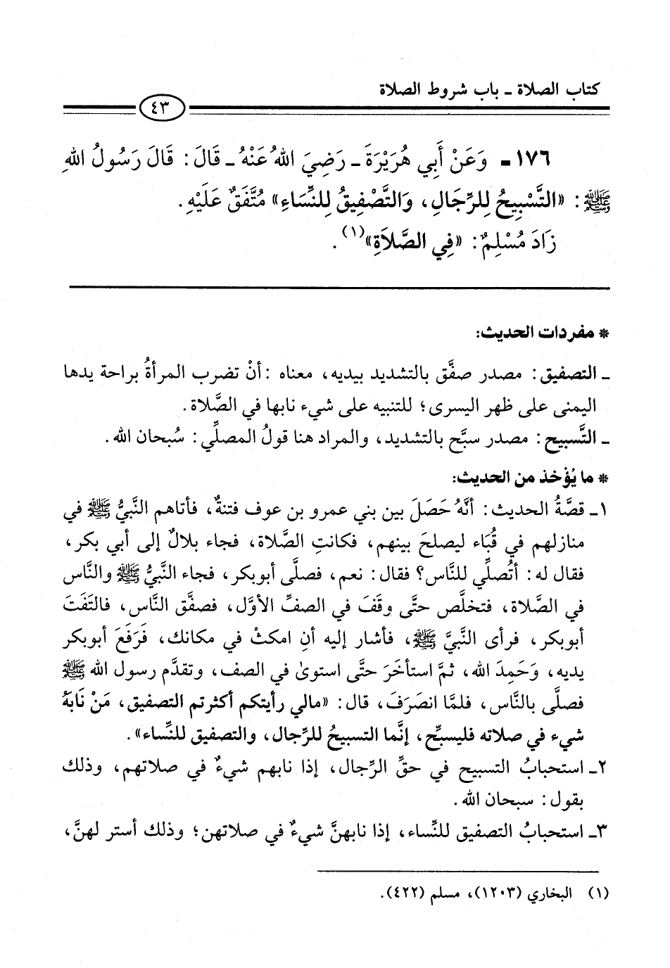 176 - وَعَنْ أَبِي هُرَيْرَةَ -رَضِيَ اللهُ عَنْهُ- قَالَ: قَالَ رَسُولُ اللهِ -صلى الله عليه وسلم-: "التَّسْبِيحُ لِلرِّجَالِ، وَالتَّصْفِيقُ لِلنِّسَاءِ" مُتَّفَق عَلَيْهِ.