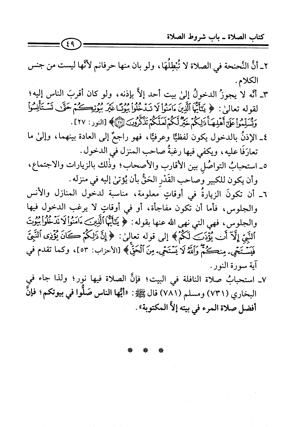 6 - أن تكونَ الزيارةُ في أوقاتٍ معلومة، مناسبة لدخول المنازل والأنس والجلوس، فأمَّا أن تكون مفاجأة، أو في أوقاتٍ لا يرغب الدخول فيها والجلوس، فهي التي نهى الله عنها بقوله: {يَاأَيُّهَا الَّذِينَ آمَنُوا لَا تَدْخُلُوا بُيُوتَ النَّبِيِّ إِلَّا أَنْ يُؤْذَنَ لَكُمْ} إلى قوله تعالى: {إِنَّ ذَلِكُمْ كَانَ يُؤْذِي النَّبِيَّ فَيَسْتَحْيِي مِنْكُمْ وَاللَّهُ لَا يَسْتَحْيِي مِنَ الْحَقِّ} [الأحزاب: 53]، وكما تقدم في آية سورة النور.