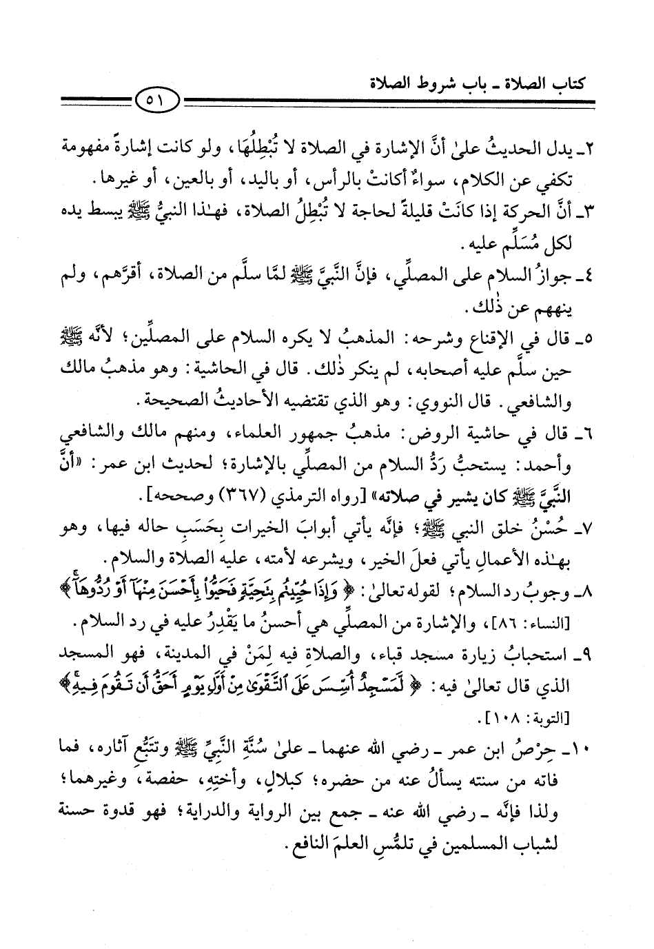 8 - وجوبُ رد السلام؛ لقوله تعالى: {وَإِذَا حُيِّيتُمْ بِتَحِيَّةٍ فَحَيُّوا بِأَحْسَنَ مِنْهَا أَوْ رُدُّوهَا} [النساء: 86]، والإشارة من المصلِّي هي أحسنُ ما يَقْدِرُ عليه في رد السلام.
