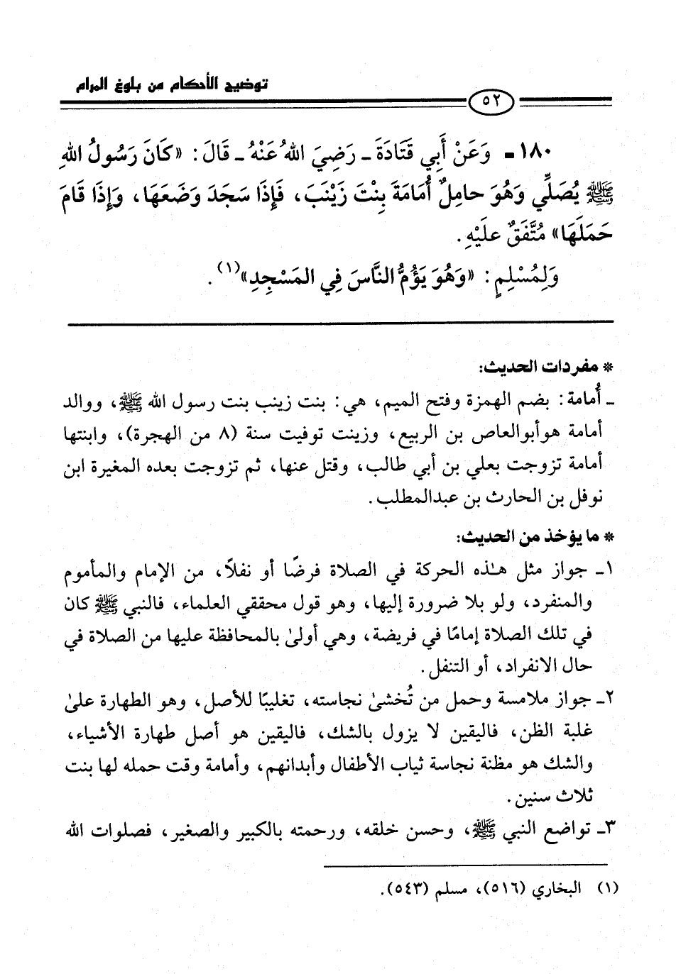 180 - وَعَنْ أَبي قتادَةَ -رَضِيَ اللهُ عَنْهُ- قَالَ: "كانَ رَسُولُ اللهِ -صلى الله عليه وسلم- يُصَلِّي وَهُوَ حامِلٌ أُمَامَةَ بِنْتَ زَيْنَبَ، فَإِذَا سَجَدَ وَضَعَهَا، وَإِذَا قَامَ حَمَلَهَا" مُتَّفَقٌ علَيْهِ.