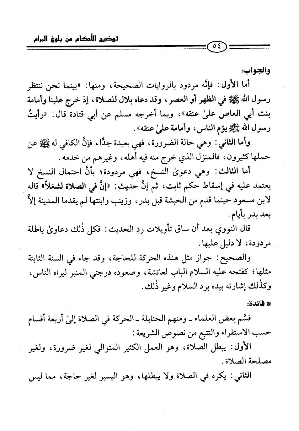 أما الثالث: وهي دعوى النسخ، فهي مردودة؛ بانَّ احتمال النسخ لا يعتمد عليه في إسقاط حكم ثابت، ثم إنَّ حديث: "إنَّ في الصلاة لشغلًا" قاله لابن مسعود حينما قدم من الحبشة قبل بدر، وزينب وابنتها لم يقدما المدينة إلاَّ بعد بدر بأيام.
