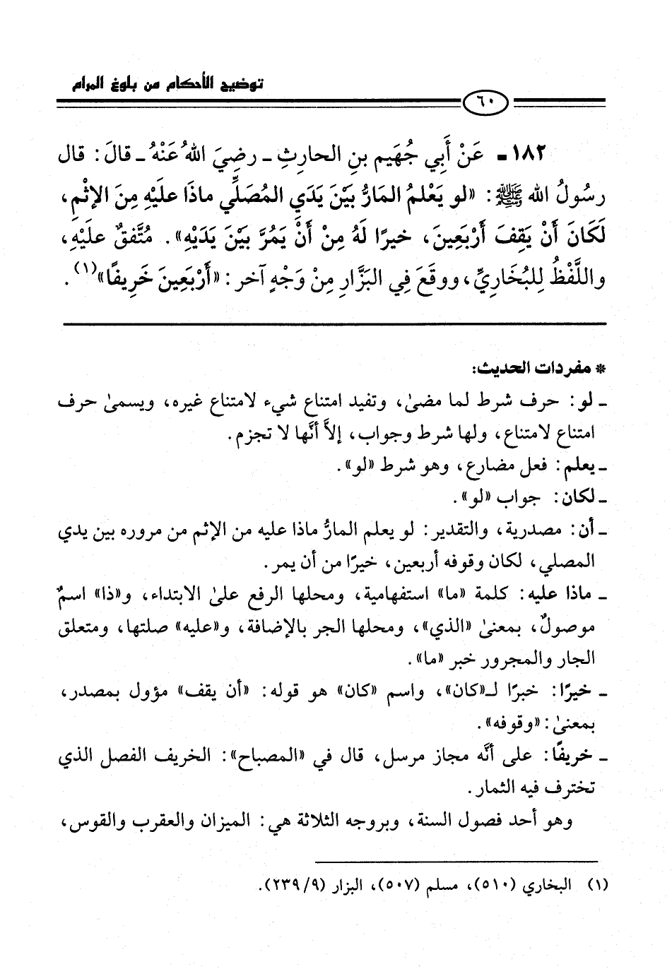 182 - عَنْ أَبِي جُهَيم بنِ الحارِثِ -رضِيَ اللهُ عَنْهُ- قالَ: قال رسُولُ الله -صلى الله عليه وسلم-: "لو يَعْلمُ المَارُّ بَيْنَ يَدَيِ المُصَلِّي مَاذَا علَيْهِ مِنَ الإثْمِ، لَكَانَ أَنْ يَقِفَ أرْبَعِينَ، خيرًا لَهُ مِنْ أَنْ يَمُرَّ بَيْنَ يَدَيْهِ". مُتَّفقٌ علَيْهِ، واللَّفْظُ لِلبُخَارِيِّ، ووقَعَ فِي البَزَّارِ مِنْ وَجْهٍ آخر: "ارْبَعِينَ خَرِيفًا" (¬1).