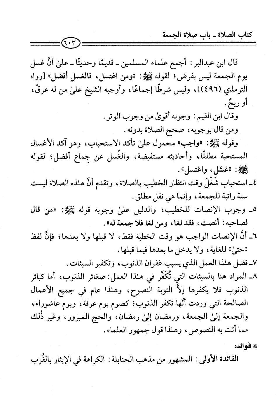 قال ابن عبد البر: أجمع علماء المسلمين -قديمًا وحديثًا- على أنَّ غسل يوم الجمعة ليس بفرض؛ لقوله -صلى الله عليه وسلم-: "ومن اغتسل، فالغسل أفضل" [رواه الترمذي (496)]، وليس شرطًا إجماعًا، وأوجبه الشيخ على من له عرقٌ، أو ريحٌ.