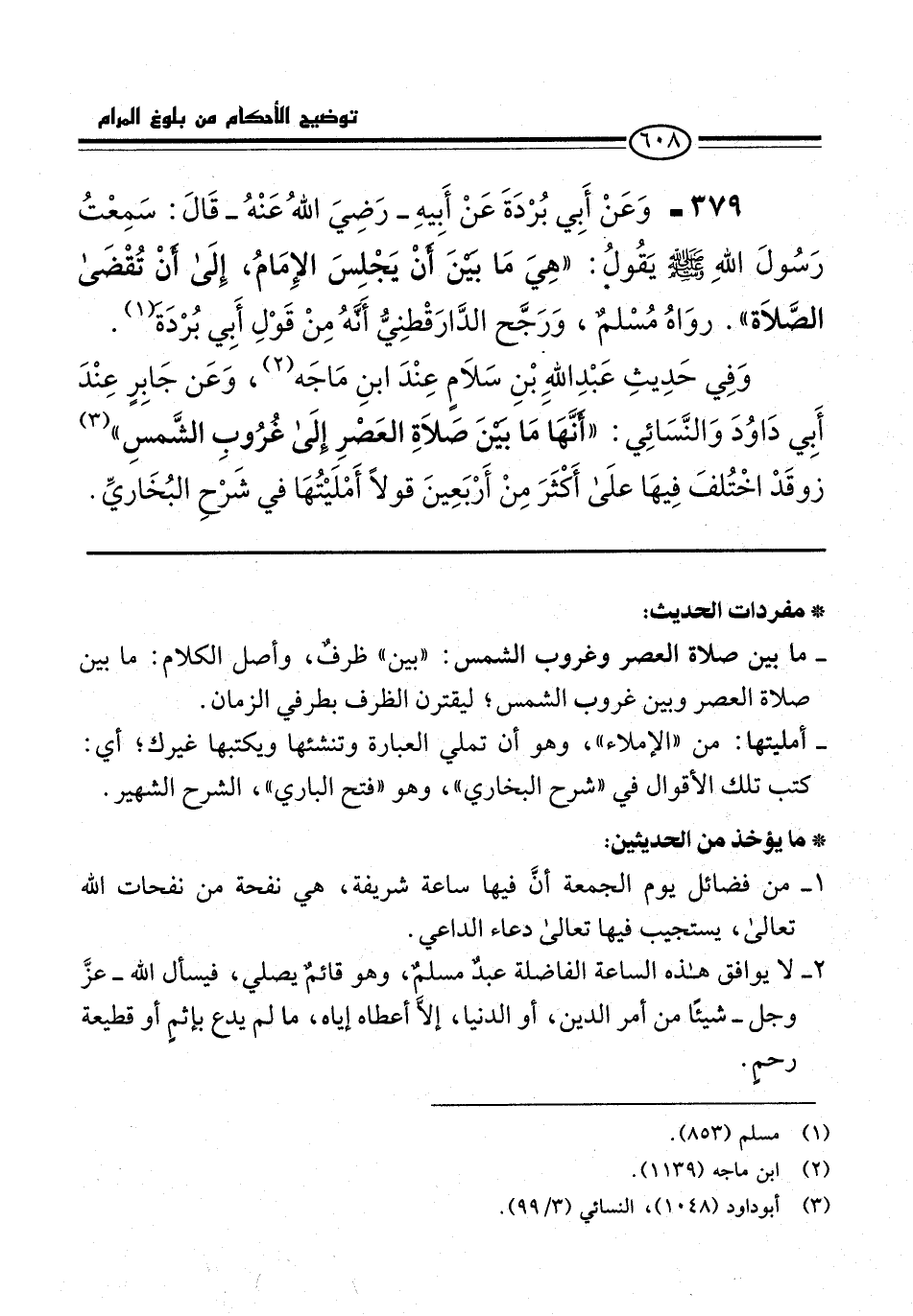 379 - وَعَنْ أَبِي بُرْدَةَ عَنْ أَبِيهِ -رَضِيَ اللهُ عَنْهُ- قَالَ: سَمِعْتُ رَسُولَ اللهِ -صلى الله عليه وسلم- يقُولُ: "هِيَ مَا بَيْنَ أنْ يَجْلِسَ الإِمَامُ، إِلَى أنْ تُقْضَى الصَّلاَة". روَاهُ مُسْلمٌ، وَرَجَّح الدَّارَقْطنِيُّ أَنَّهُ مِنْ قَوْلِ أَبِي بُرْدَةَ (¬1).