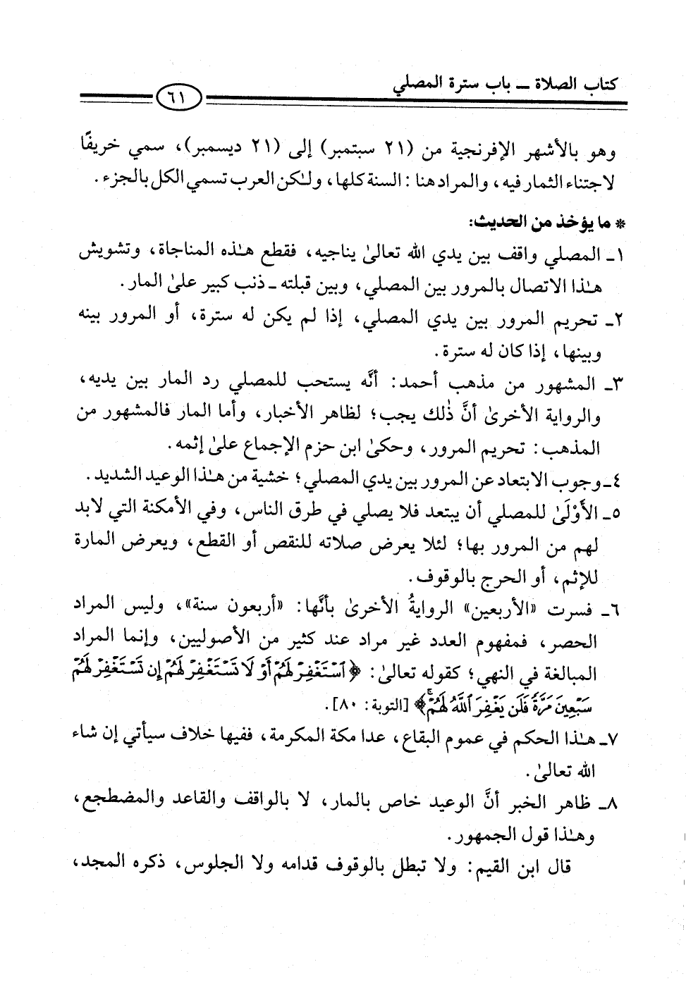 2 - تحريم المرور بين يدي المصلي، إذا لم يكن له سترة، أو المرور بينه وبينها، إذا كان له سترة.