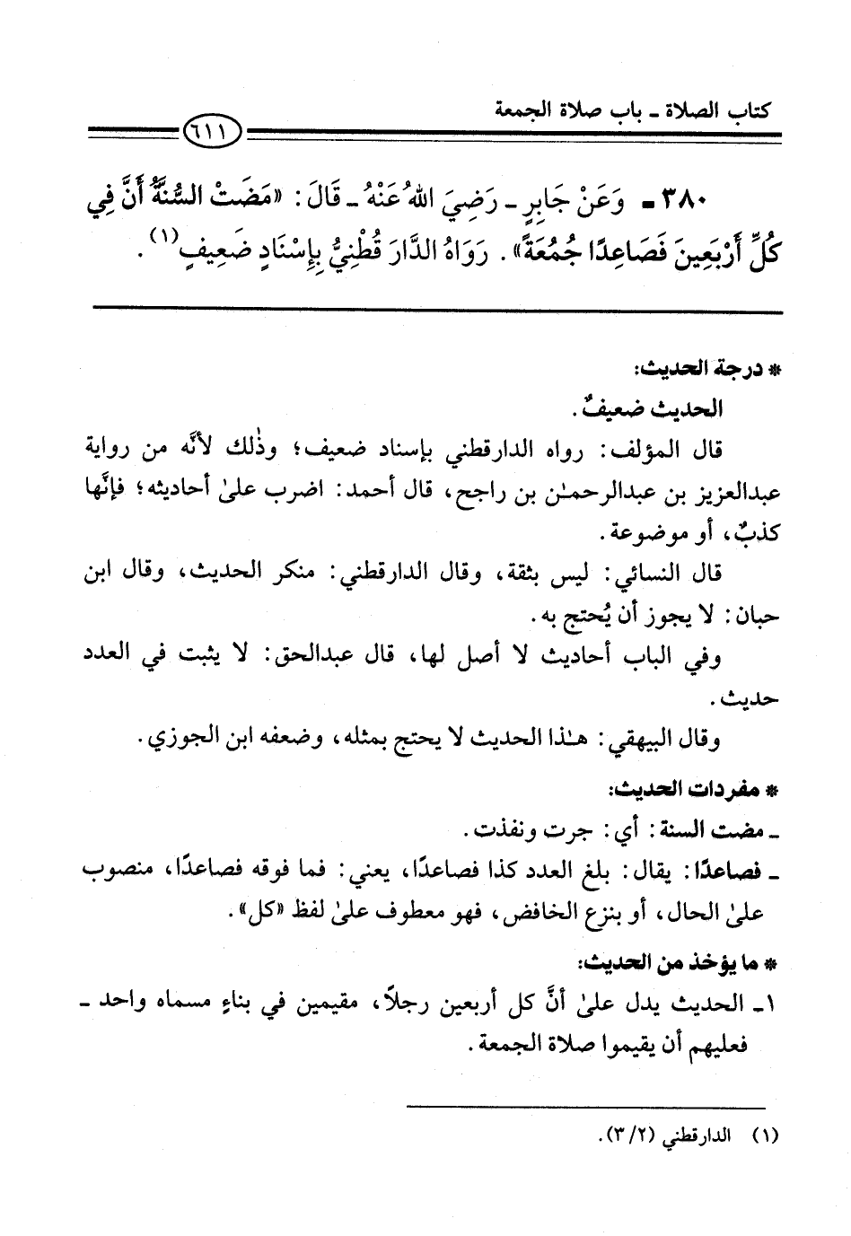 380 - وَعَنْ جَابِرٍ -رَضِيَ اللهُ عَنْهُ- قَالَ: "مَضَتْ السُّنَّةُ أَنَّ فِي كُلِّ أَرْبَعِينَ فَصَاعِدًا جُمُعَةً". رَوَاهُ الدَّارَقُطْنِيُّ بِإِسْنَادٍ ضَعِيفٍ (¬1).