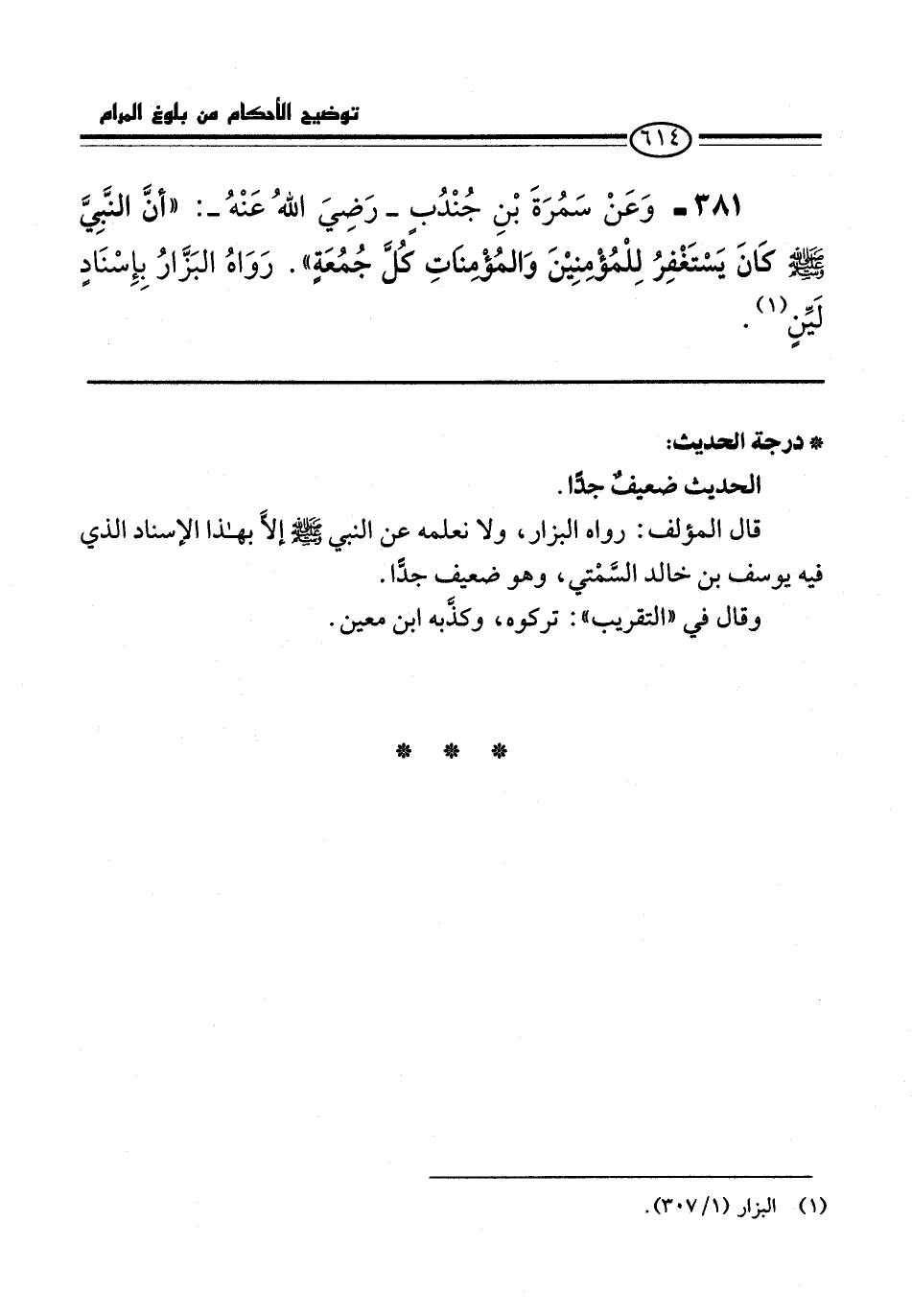 381 - وَعَنْ سَمُرَةَ بْنِ جُنْدُبٍ -رَضِيَ اللهُ عَنْهُ-: "أنَّ النَّبِيَّ -صلى الله عليه وسلم- كَانَ يَسْتَغْفِرُ لِلْمُؤْمِنِيْنَ وَالمُؤْمِنَاتِ كُلَّ جُمُعَةٍ". رَوَاهُ البَزَّارُ بِإِسْنَادٍ لَيِّنٍ (¬1).
