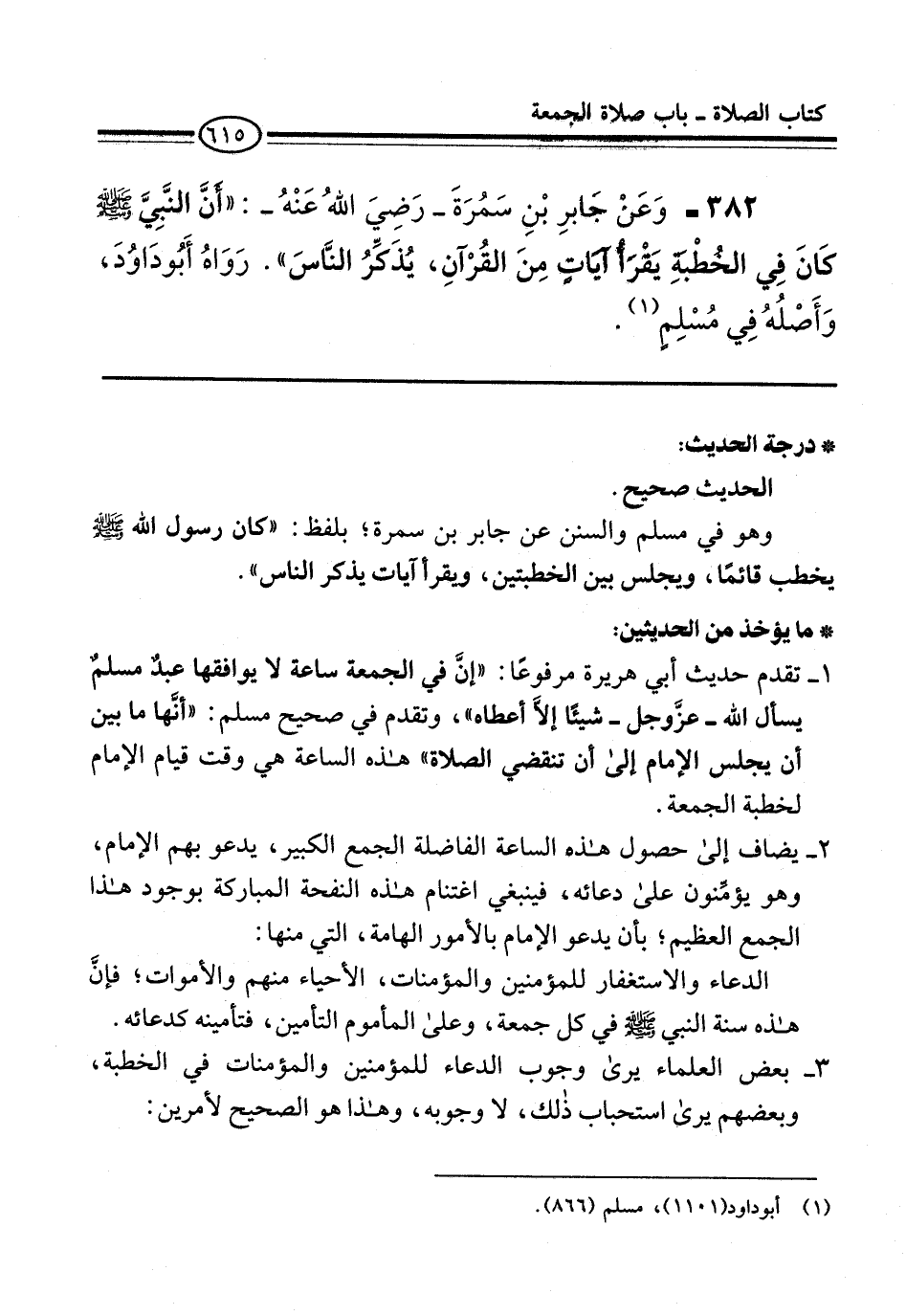 382 - وَعَنْ جَابرِ بْنِ سَمُرَةَ -رَضِيَ اللهُ عَنْهُ-: "أَنَّ النَّبيَّ -صلى الله عليه وسلم- كَانَ فِي الخُطْبَةِ يَقْرَأُ آيَاتٍ مِنَ القُرْآنِ، يُذَكِّرُ النَّاسَ". رَوَاهُ أَبُو دَاوُدَ، وَأَصْلُهُ فِي مُسْلِمٍ (¬1).