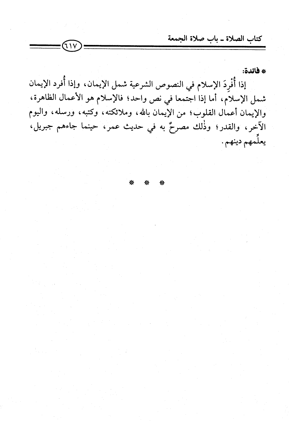 إذا أُفْرِدَ الإسلام في النصوص الشرعية شمل الإيمان، وإذا أُفرد الإيمان شمل الإسلام، أما إذا اجتمعا في نص واحد؛ فالإسلام هو الأعمال الظاهرة، والإيمان أعمال القلوب؛ من الإيمان بالله، وملائكته، وكتبه، ورسله، واليوم الآخر، والقدر؛ وذلك مصرحٌ به في حديث عمر، حينما جاءهم جبريل، يعلِّمهم دينهم.