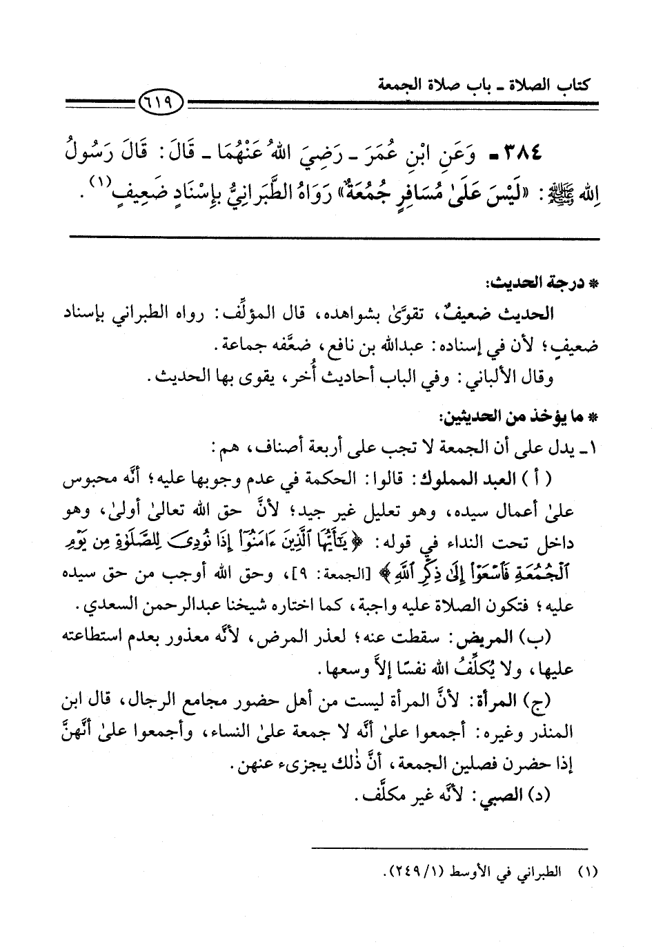 384 - وَعَنِ ابْنِ عُمَرَ -رَضِيَ اللهُ عَنْهُمَا- قَالَ: قَالَ رَسُولُ الله -صلى الله عليه وسلم-: "لَيْسَ عَلَى مُسَافِرٍ جُمُعَةٌ" رَوَاهُ الطَّبَرانِيُّ بإِسْنَادٍ ضَعِيفٍ (¬1).