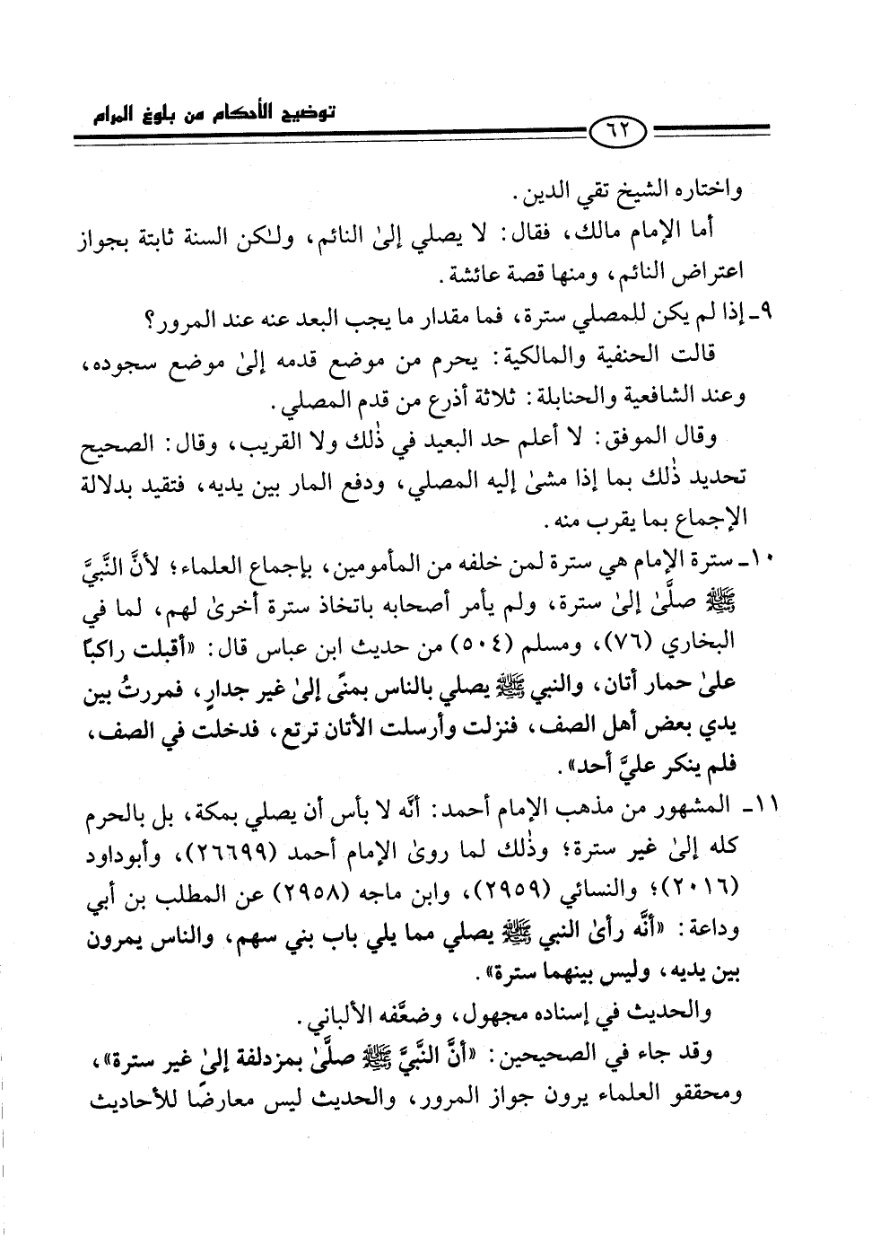 وقد جاء في الصحيحين: "أنَّ النَّبيَّ -صلى الله عليه وسلم- صلَّى بمزدلفة إلى غير سترة"، ومحققو العلماء يرون جواز المرور، والحديث ليس معارضًا للأحاديث