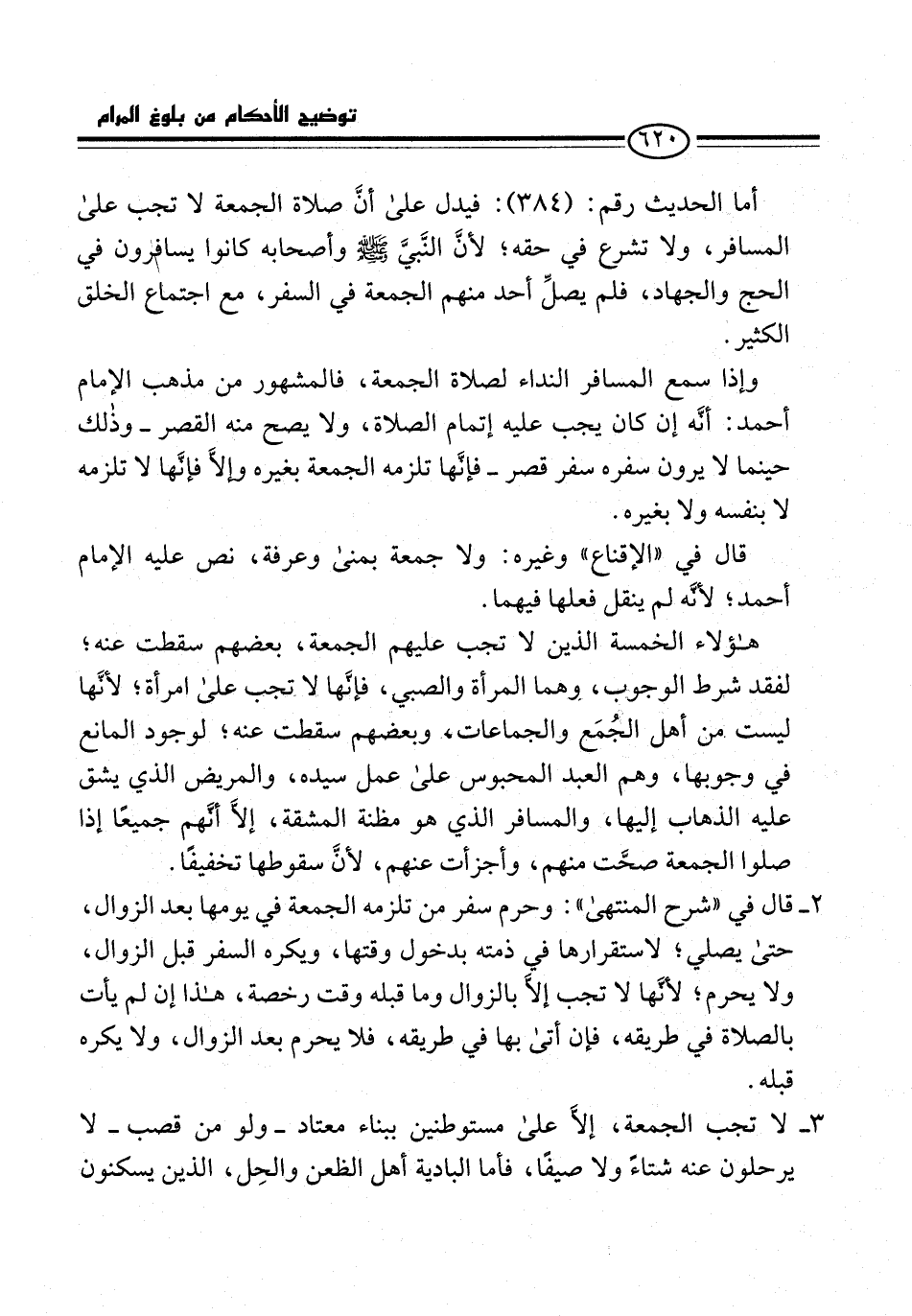 أما الحديث رقم: (384): فيدل على أن صلاة الجمعة لا تجب على المسافر، ولا تشرع في حقه؛ لأنَّ النَّبيَّ -صلى الله عليه وسلم- وأصحابه كانوا يسافرون في الحج والجهاد، فلم يصلِّ أحد منهم الجمعة في السفر، مع اجتماع الخلق الكثير.