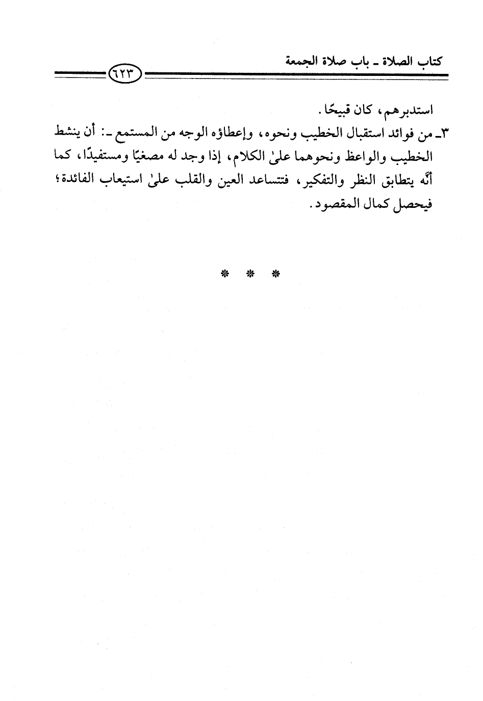 3 - من فوائد استقبال الخطيب ونحوه، وإعطاؤه الوجه من المستمع-: أن ينشط الخطيب والواعظ ونحوهما على الكلام، إذا وجد له مصغيًا ومستفيدًا، كما أنَّه يتطابق النظر والتفكير، فتتساعد العين والقلب على استيعاب الفائدة؛ فيحصل كمال المقصود.