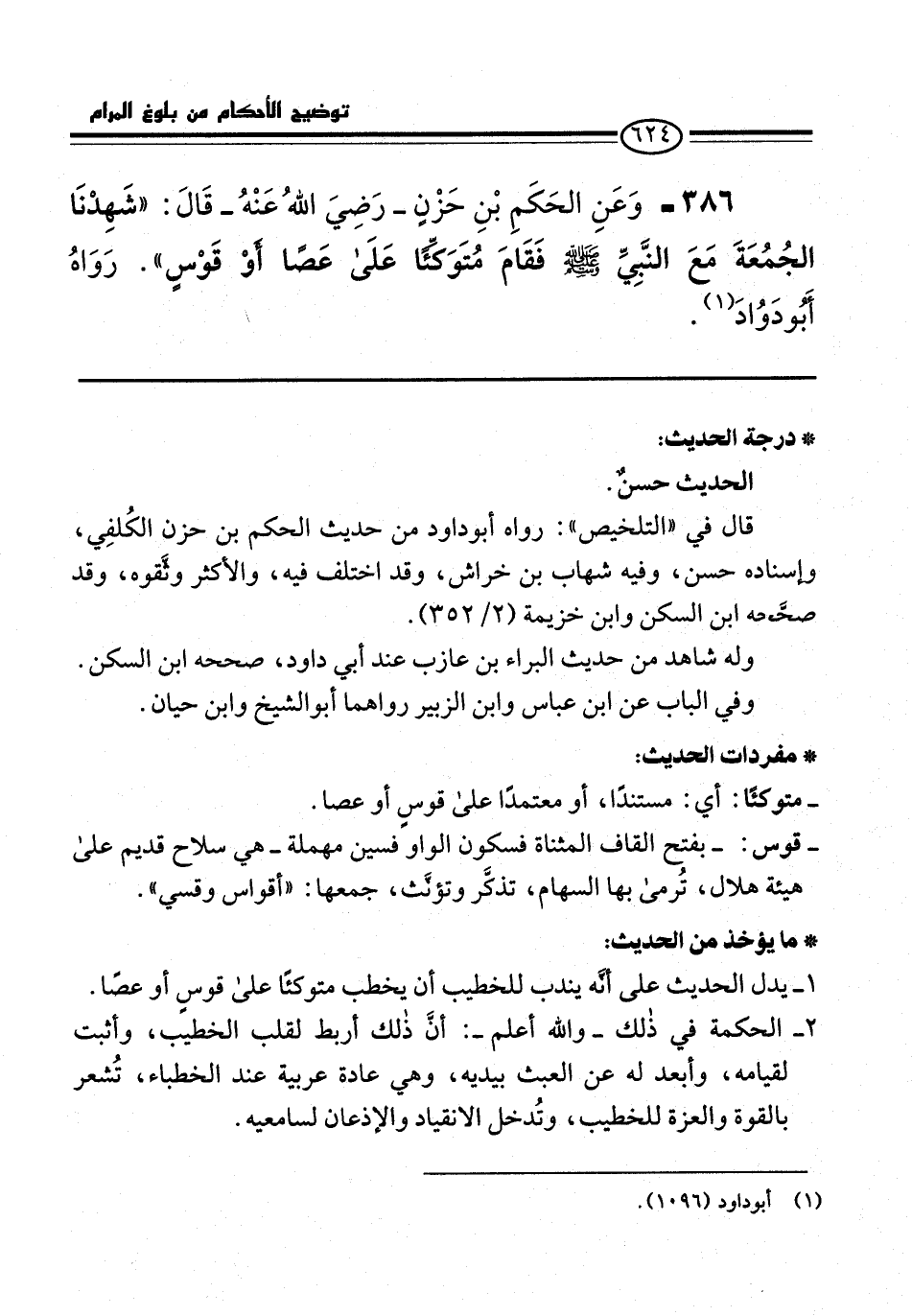 386 - وَعَنِ الحَكَمِ بْنِ حَزْنٍ -رَضِيَ اللهُ عَنْهُ- قَالَ: "شَهِدْنَا الجُمُعَةَ مَعَ النَّبِيِّ -صلى الله عليه وسلم- فَقَامَ مُتَوَكِّئًا عَلَى عَصًا أَوْ قَوْسٍ". رَوَاهُ أَبُو دَوُادَ (¬1).