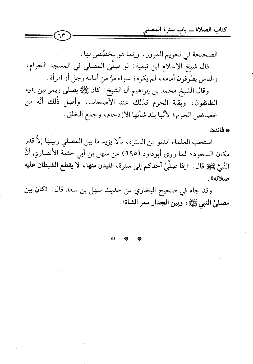 وقال الشيخ محمد بن إبراهيم آل الشيخ: كان -صلى الله عليه وسلم- يصلي ويمر بين يديه الطائفون، وبقية الحرم كذلك عند الأصحاب، وأصل ذلك أنَّه من خصائص الحرم؛ لأنَّها بلد شأنها الازدحام، وجمع الخلق.