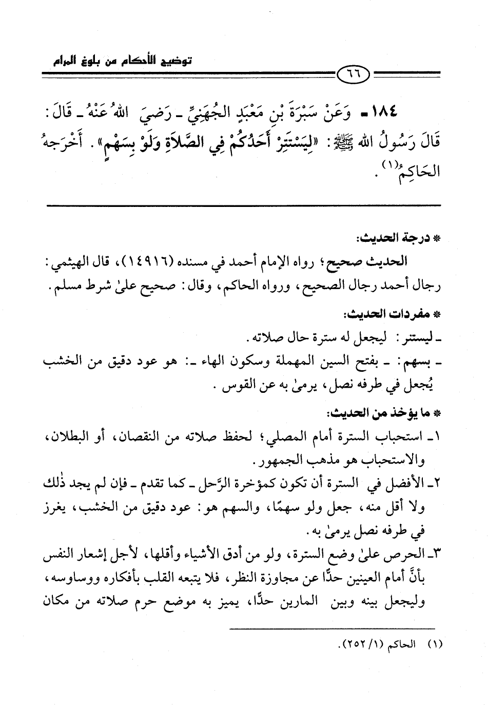 184 - وَعَنْ سَبْرَةَ بْنِ مَعْبَدٍ الجُهَنِيِّ -رَضيَ اللهُ عَنْهُ- قَالَ: قَالَ رَسُولُ الله -صلى الله عليه وسلم-: "لِيَسْتَتِرْ أَحَدُكُمْ فِي الصَّلَاةِ وَلَوْ بِسَهْمٍ". أَخْرَجهُ الحَاكِمُ (¬1).