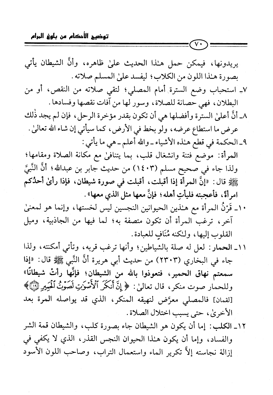 11 - الحمار: لعل له صلة بالشياطين؛ وأنها ترغب قربه، وتأتي أمكنته، ولذا جاء في البخاري (2303) من حديث أبي هريرة أنَّ النَّبي -صلى الله عليه وسلم- قال: "إذا سمعتم نهاق الحمير، فتعوذوا بالله من الشيطان؛ فإنَّها رأت شيطانًا" وللحمار صوت منكر، قال تعالى: {إِنَّ أَنْكَرَ الْأَصْوَاتِ لَصَوْتُ الْحَمِيرِ (19)} [لقمان: 19]، فالمصلي معرَّض لنهيقه المنكر، الذي قد يواصله المرة بعد الأخرى، حتى يسبب اختلال الصلاة.