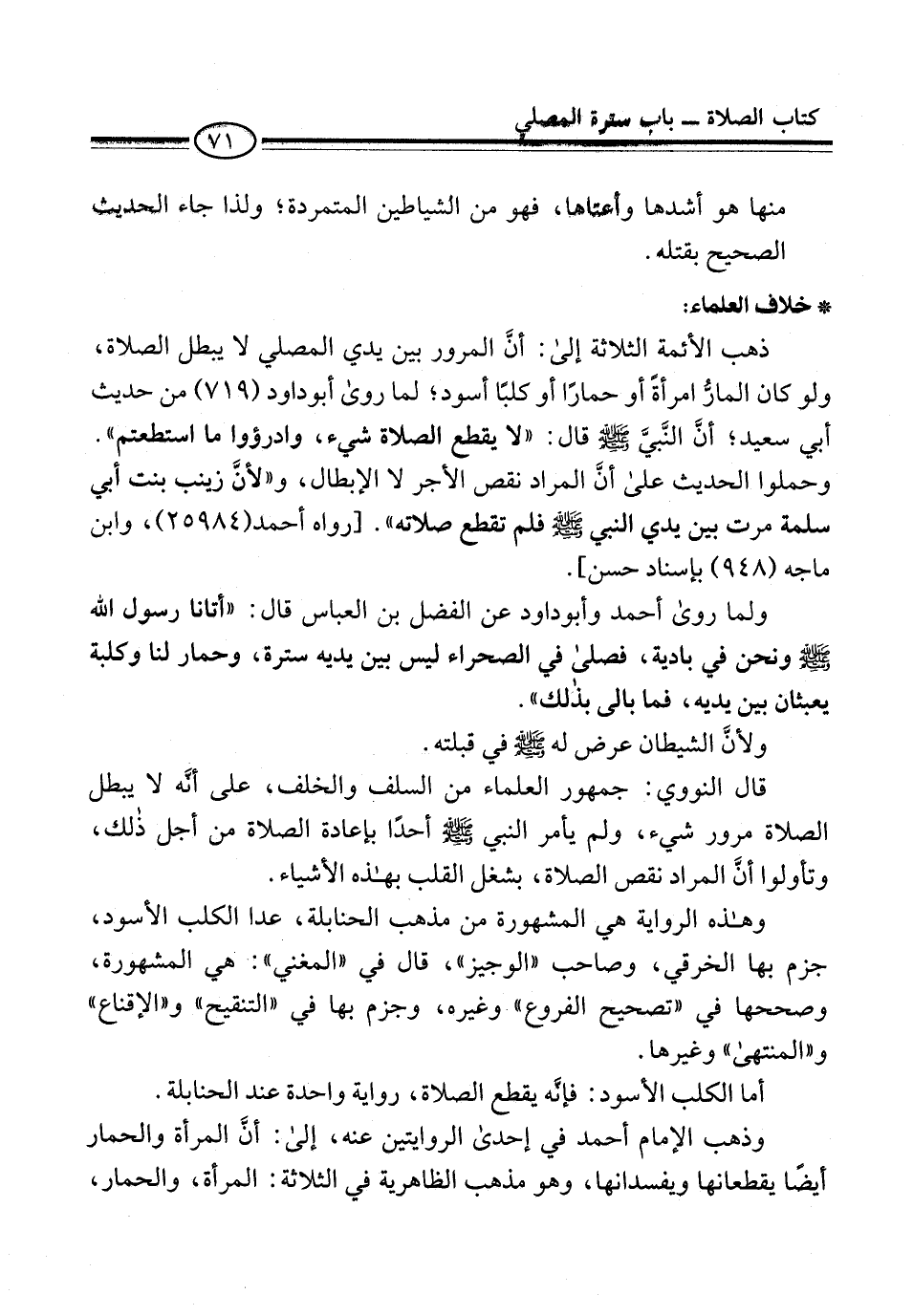 ذهب الأئمة الثلاثة إلى: أنَّ المرور بين يدي المصلي لا يبطل الصلاة، ولو كان المارُّ امرأةً أو حمارًا أو كلبًا أسود؛ لما روى أبو داود (719) من حديث أبي سعيدة أنَّ النَّبيَّ -صلى الله عليه وسلم- قال: "لا يقطع الصلاة شيء، وادرؤوا ما استطعتم". وحملوا الحديث على أنَّ المراد نقص الأجر لا الإبطال، و"لأنَّ زينب بنت أبي سلمة مرت بين يدي النبي -صلى الله عليه وسلم- فلم تقطع صلاته". [رواه أحمد (25984)، وابن ماجه (948) بإسناد حسن].