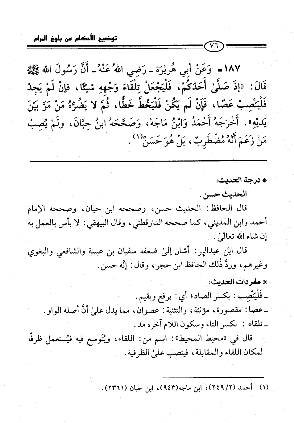 187 - وَعَنْ أبِي هُريْرَة -رَضِي اللهُ عَنْهُ- أَنَّ رَسُولَ الله -صلى الله عليه وسلم- قَالَ: "إذَ صَلَّى أَحَدُكُمْ، فَلْيَجْعَلْ تِلْقَاءَ وَجْهِهِ شيْئًا، فإنْ لَمْ يَجِدْ فَلْيَنْصِبْ عَصًا، فَإَنْ لَم يَكُنْ فَلْيَخُطَّ خَطًّا، ثُمَّ لا يَضُرُّهُ مَنْ مَرَّ بَيْنَ يَديْهِ". أَخْرَجَهُ أَحْمَدُ وَابْنُ مَاجَهْ، وَصَحَّحَهُ ابنُ حِبَّانَ، ولَمْ يُصِبْ مَنْ زَعَمَ أَنَّهُ مُضْطَرِبٌ، بَلْ هُوَ حَسَنٌ (¬1).