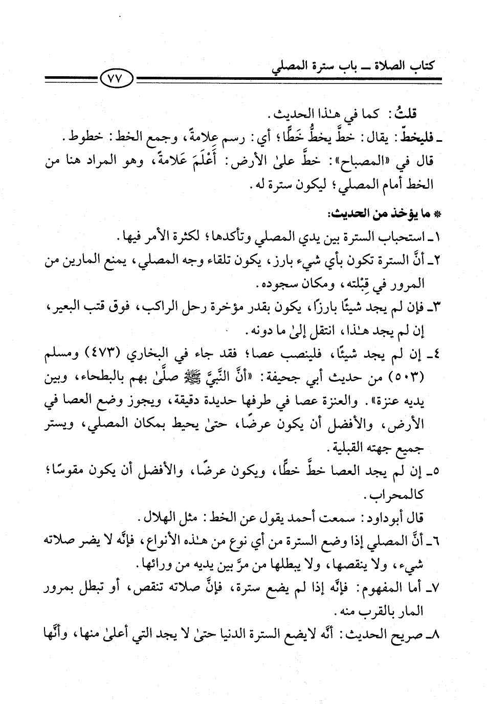 5 - إن لم يجد العصا خطَّ خطًّا، ويكون عرضًا، والأفضل أن يكون مقوسًا؛ كالمحراب.