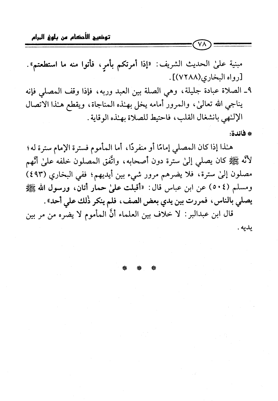 9 - الصلاة عبادة جليلة، وهي الصلة بين العبد وربه، فإذا وقف المصلي فإنه يناجي الله تعالى، والمرور أمامه يخل بهلذه المناجاة، ويقطع هذا الاتصال الإلهي بانشغال القلب، فاحتيط للصلاة بهذه الوقاية.