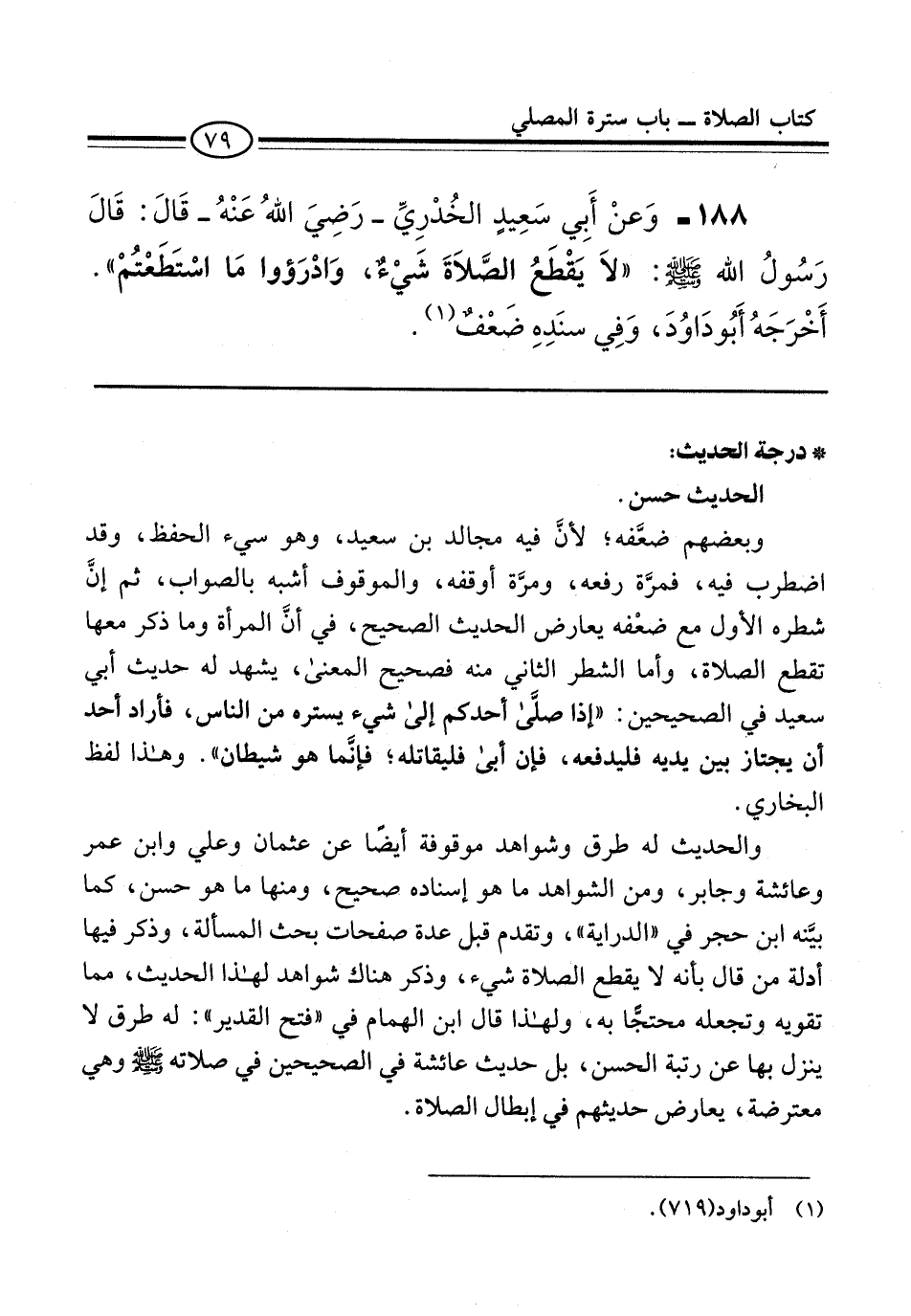 188 - وَعنْ أَبِي سَعِيدٍ الخُدْرِيِّ -رَضِيَ اللهُ عَنْهُ- قَالَ: قَالَ رَسُولُ الله -صلى الله عليه وسلم-: "لَا يَقْطَعُ الصَّلَاةَ شَيْءٌ، وَادْرَؤوا مَا اسْتَطَعْتُمْ". أَخْرَجَهُ أَبُو دَاوُدَ، وَفِي سنَدِهِ ضَعْفٌ (¬1).