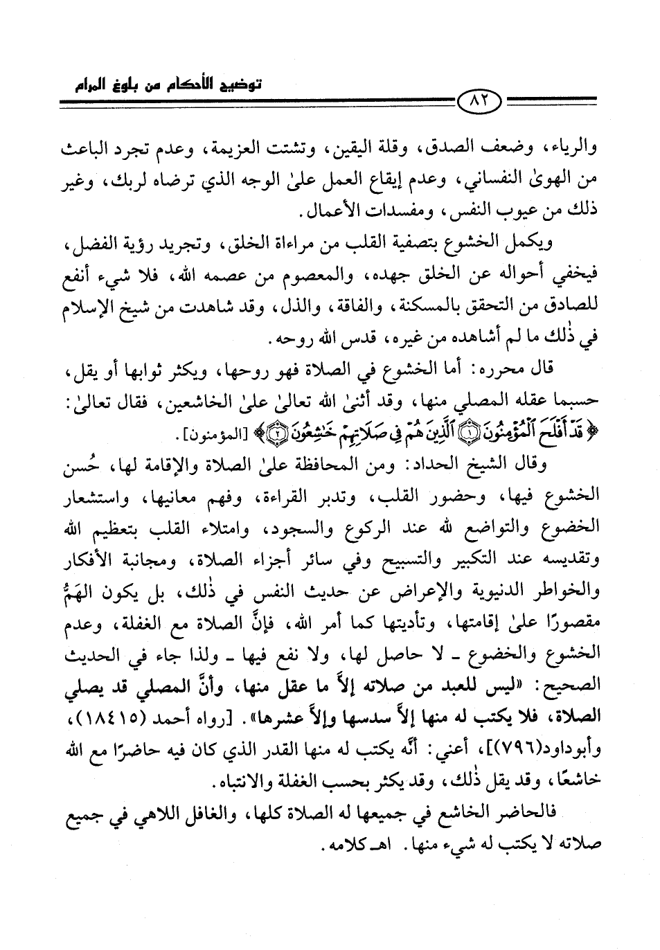 وقال الشيخ الحداد: ومن المحافظة على الصلاة والإقامة لها، حُسن الخشوع فيها، وحضور القلب، وتدبر القراءة، وفهم معانيها، واستشعار الخضوع والتواضع لله عند الركوع والسجود، وامتلاء القلب بتعظيم الله وتقديسه عند التكبير والتسبيح وفي سائر أجزاء الصلاة، ومجانبة الأفكار والخواطر الدنيوية والإعراض عن حديث النفس في ذلك، بل يكون الهَمُّ مقصورًا على إقامتها، وتأديتها كما أمر الله، فإنَّ الصلاة مع الغفلة، وعدم الخشوع والخضوع -لا حاصل لها، ولا نفع فيها- ولذا جاء في الحديث التصحيح: "ليس للعبد من صلاته إلاَّ ما عقل منها، وأنَّ المصلي قد يصلي الصلاة، فلا يكتب له منها إلاَّ سدسها وإلاَّ عشرها". [رواه أحمد (18415)، وأبو داود (796)]، أعني: أنَّه يكتب له منها القدر الذي كان فيه حاضرًا مع الله خاشعًا، وقد يقل ذلك، وقد يكثر بحسب الغفلة والانتباه.