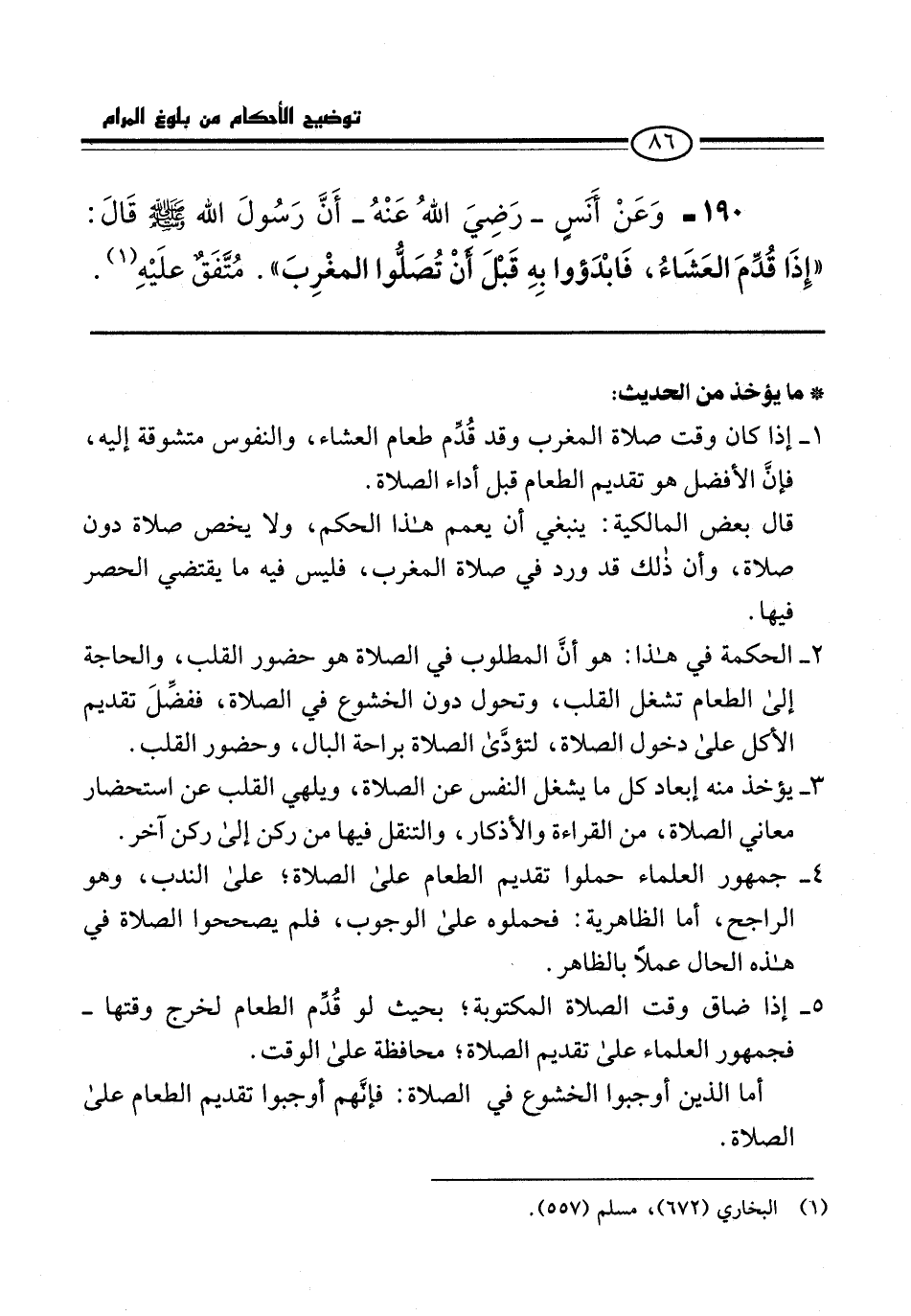 190 - وَعَنْ أَنَسٍ -رَضِيَ اللهُ عَنْهُ- أَنَّ رَسُولَ الله -صلى الله عليه وسلم- قَالَ: "إِذَا قُدِّمَ العَشَاءُ، فَابْدَؤوا بِهِ قَبْلَ أَنْ تُصَلُّوا المغْرِبَ". مُتَّفَقٌ علَيْهِ (¬1).