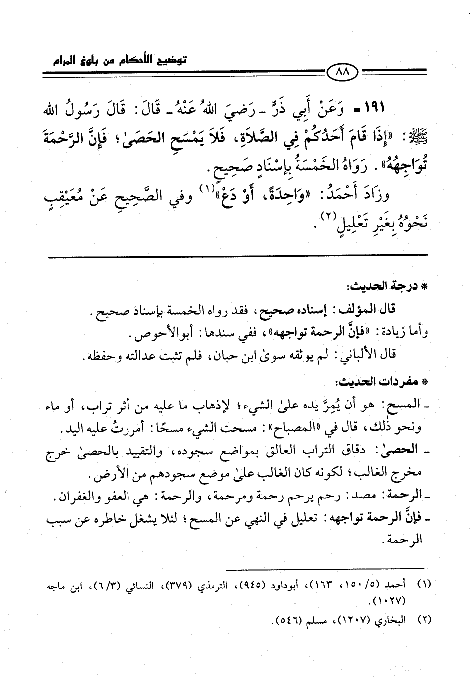 191 - وَعَنْ أَبِي ذَرٍّ -رَضيَ اللهُ عَنْهُ- قَالَ: قَالَ رَسُولُ الله -صلى الله عليه وسلم-: "إِذَا قَامَ أَحَدُكُمْ فِي الصَّلَاةِ، فَلَا يَمْسَحِ الحَصَى؛ فَإنَّ الرَّحْمَةَ تُوَاجِهُهُ". رَوَاهُ الخَمْسَةُ بِإسْنَادٍ صَحِيحٍ.