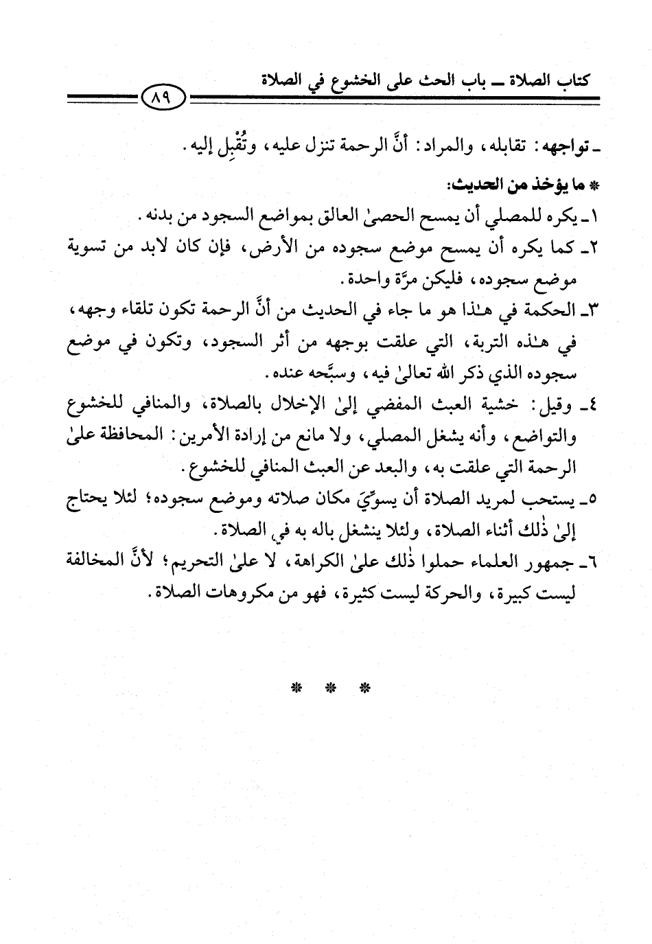 1 - يكره للمصلي أن يمسح الحصى العالق بمواضع السجود من بدنه.