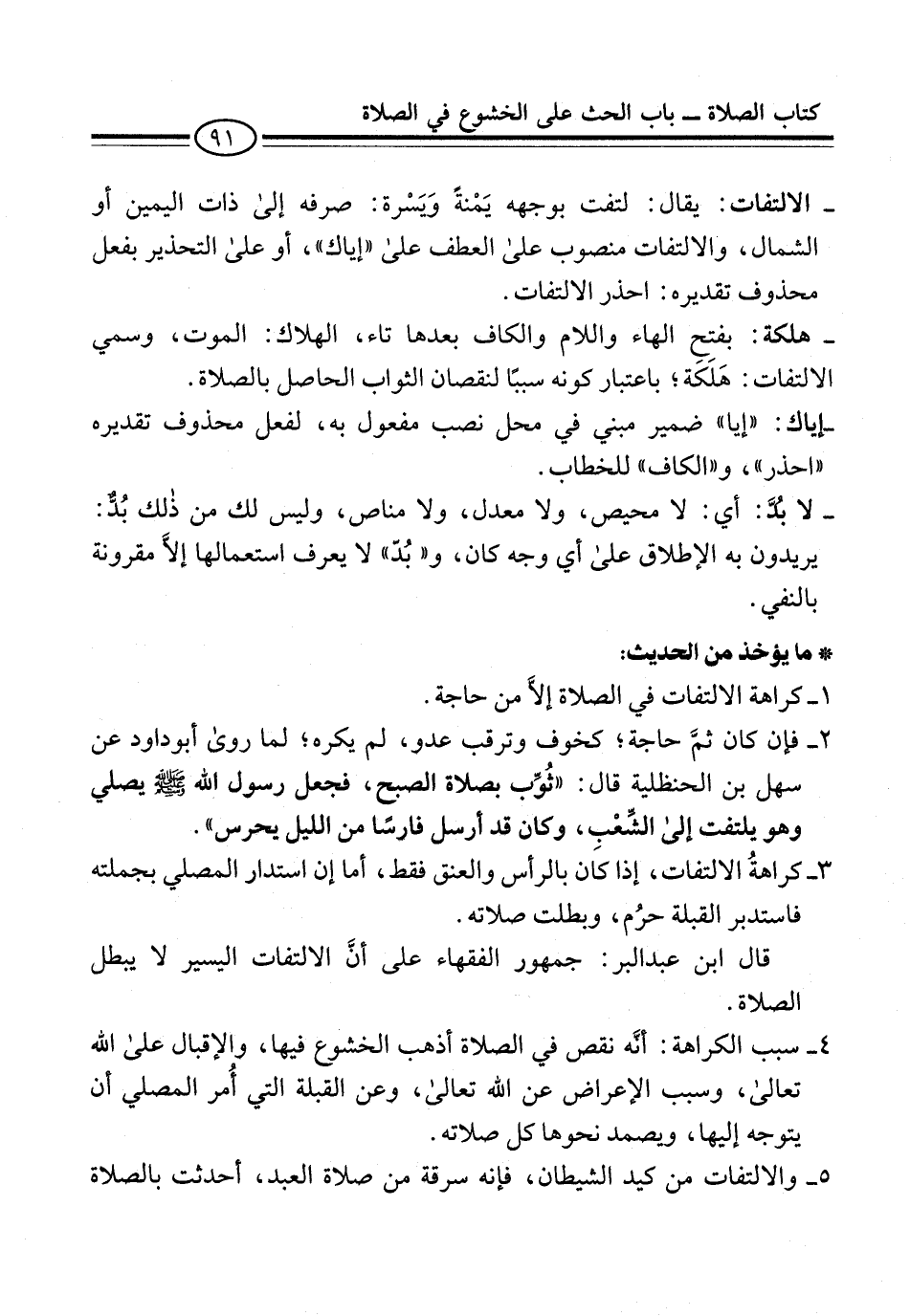 1 - كراهة الالتفات في الصلاة إلاَّ من حاجة.