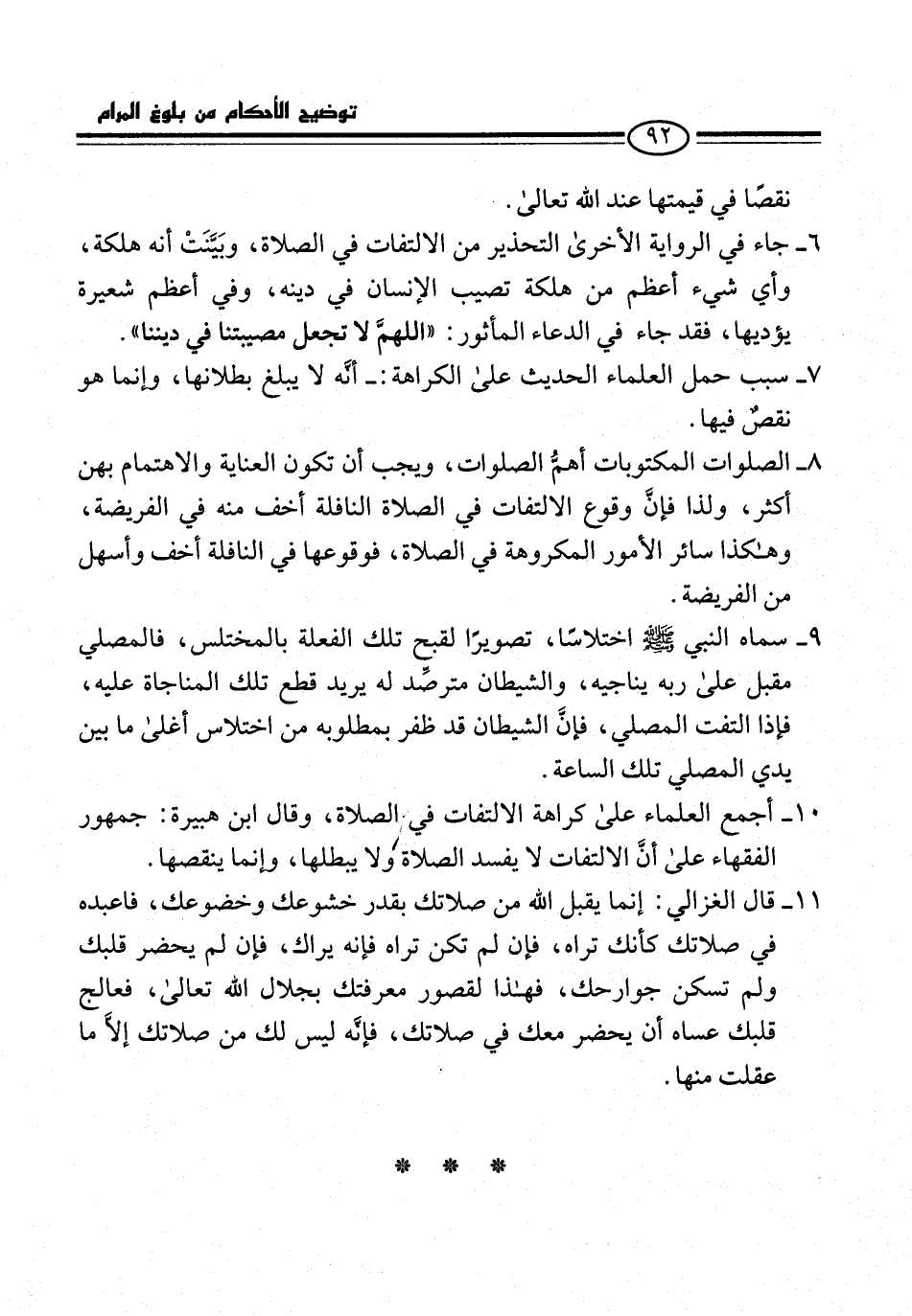 10 - أجمع العلماء على كراهة الالتفات في الصلاة، وقال ابن هبيرة: جمهور الفقهاء على أنَّ الالتفات لا يفسد الصلاة ولا يبطلها، وإنما ينقصها.
