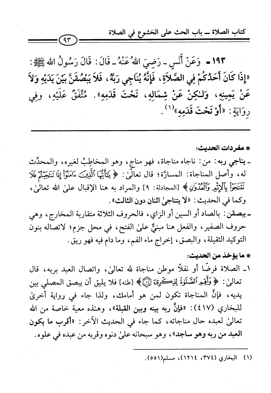 193 - وَعَنْ أَنسٍ -رَضِيَ اللهُ عَنْهُ- قَالَ: قَالَ رَسُولُ الله -صلى الله عليه وسلم-: "إِذَا كَانَ أحَدُكُمْ فِي الصَّلَاةِ، فَإنَّهُ يُنَاجِي رَبَّهُ، فَلَا يَبْصُقَنَّ بَيْنَ يَدَيْهِ وَلَا عَنْ يَمِينِهِ، وَلكِنْ عَنْ شِمَالِهِ، تَحْتَ قَدَمِهِ". مُتَّفَقٌ عَلَيْهِ، وفِي رِوَايَةٍ: "أوْ تَحْتَ قَدَمِهِ" (¬1).