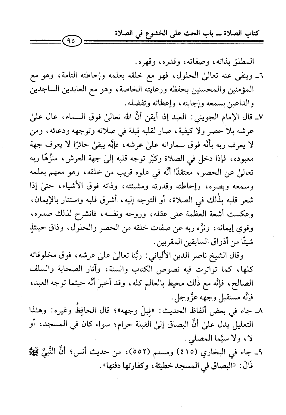 7 - قال الإمام الجويني: العبد إذا أيقن أنَّ الله تعالى فوق السماء، عال على عرشه بلا حصر ولا كيفية، صار لقلبه قِبلة في صلاته وتوجهه ودعائه، ومن لا يعرف ربه بأنَّه فوق سماواته على عرشه، فإنَّه يبقى حائرًا لا يعرف جهة معبوده، فإذا دخل في الصلاة وكبَّر توجه قلبه إلى جهة العرش، منزِّهًا ربه تعالى عن الحصر، معتقدًا أنَّه في علوه قريب من خلقه، وهو معهم بعلمه وسمعه وبصره، وإحاطته وقدرته ومشيئته، وذاته فوق الأشياء، حتى إذا شعر قلبه بذلك في الصلاة، أو التوجه إليه، أشرق قلبه واستنار بالإيمان، وعكست أشعة العظمة على عقله، وروحه ونفسه، فانشرح لذلك صدره، وقوي إيمانه، ونزَّه ربه عن صفات خلقه من الحصر والحلول، وذاق حينئذٍ شيئًا من أذواق السابقين المقربين.