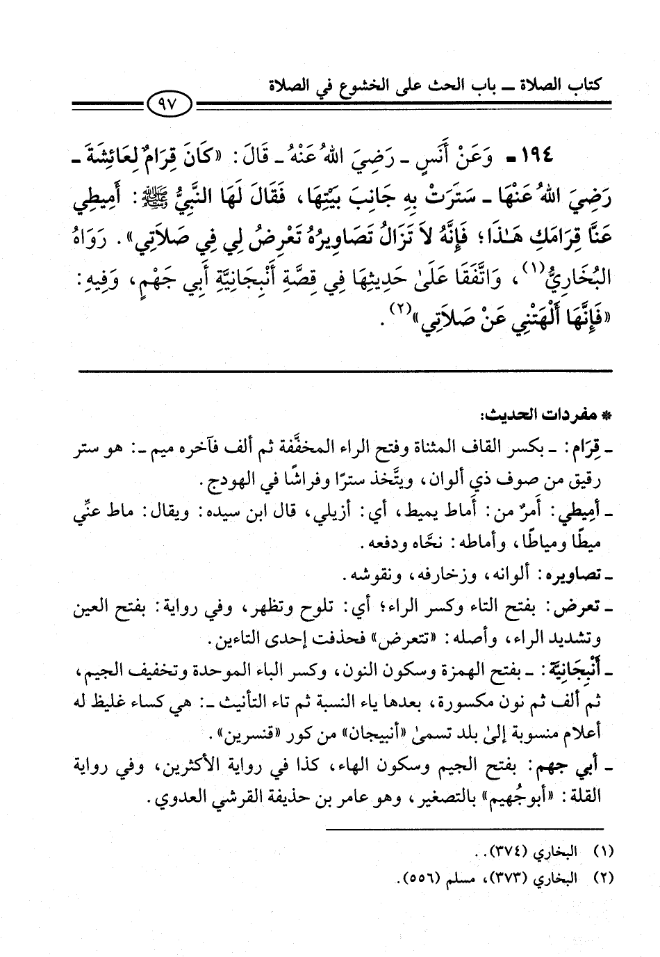 194 - وَعَنْ أَنسٍ -رَضِيَ اللهُ عَنْهُ- قَالَ: "كَانَ قِرَامٌ لِعَائشِةَ -رَضِيَ اللهُ عَنْهَا- سَتَرَتْ بِهِ جَانِبَ بَيْتِهَا، فَقَالَ لَهَا النَّبِيُّ -صلى الله عليه وسلم-: أَمِيطِي عَنَّا قِرَامَكِ هَذَا؛ فَإنَّهُ لَا تَزَالُ تَصَاوِيرُهُ تَعْرِضُ لِي فِي صَلَاتِي". رَوَاهُ البُخَارِيُّ (¬1)، وَاتَّفَقَا عَلَى حَدِيثِهَا فِي قِصَّةِ أَنْبِجَانِيَّةِ أَبِي جَهْمٍ، وَفِيهِ: "فَإِنَّهَا ألْهَتْنِي عَنْ صَلَاتِي" (¬2).