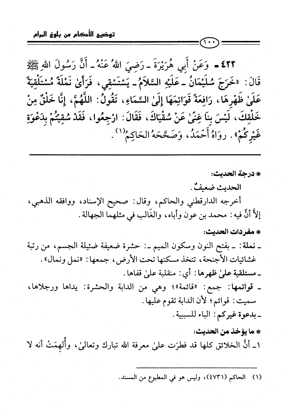 422 - وَعَنْ أَبِي هُرَيْرَةَ -رَضِيَ اللهُ عَنْهُ- أَنَّ رَسُولَ اللهِ -صلى الله عليه وسلم- قَالَ: "خَرَجَ سُلَيْمَانُ -عَلَيْهِ السَّلاَمُ- يَسْتَسْقِي، فَرَأى نَمْلَةً مُسْتَلْقِيَةً عَلَى ظَهْرِهَا، رَافِعَةً قَوَائِمَهَا إِلَى السَّمَاءِ، تَقُولُ: اللَّهُمَّ، إِنَّا خَلْقٌ مِنْ خَلْقِكَ، لَيْسَ بنَا غِنًى عَنْ سُقْيَاكَ، فَقَالَ: ارْجِعُوا، فَقَدْ سُقِيْتُمْ بِدَعْوَةِ غَيْرِكُمْ". رواه أَحْمَدُ، وَصَحَّحَهُ الحَاكِمُ (¬1).