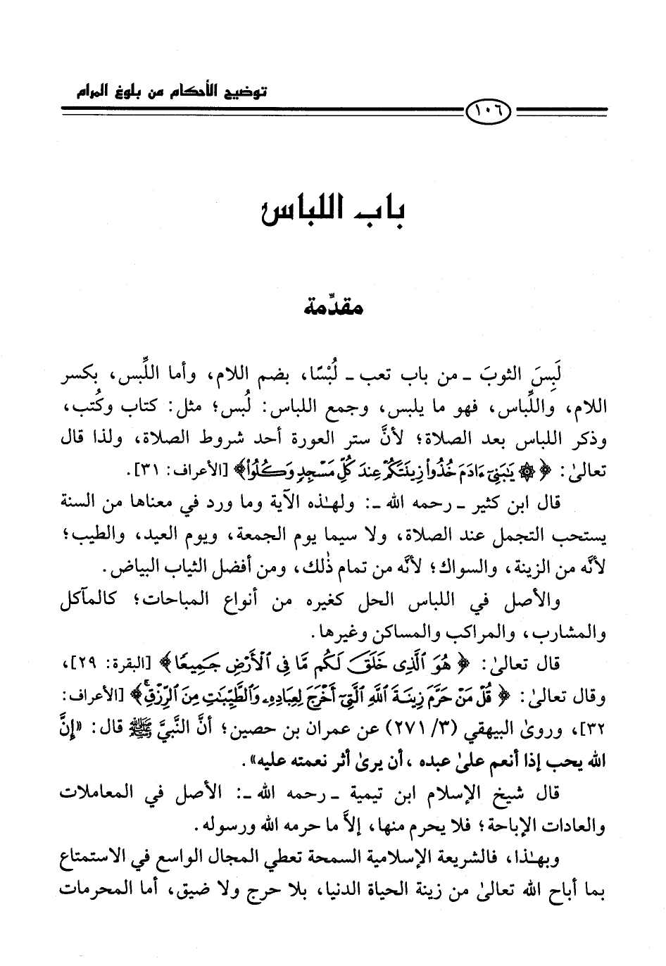 لَبِسَ الثوبَ -من باب تعب- لُبْسًا، بضم اللام، وأما اللَّبس، بكسر اللام، واللِّباس، فهو ما يلبس، وجمع اللباس: لُبس؛ مثل: كتاب وكُتب، وذكر اللباس بعد الصلاة؛ لأن ستر العورة أحد شروط الصلاة، ولذا قال تعالى: {يَابَنِي آدَمَ خُذُوا زِينَتَكُمْ عِنْدَ كُلِّ مَسْجِدٍ وَكُلُوا} [الأعراف: 31].