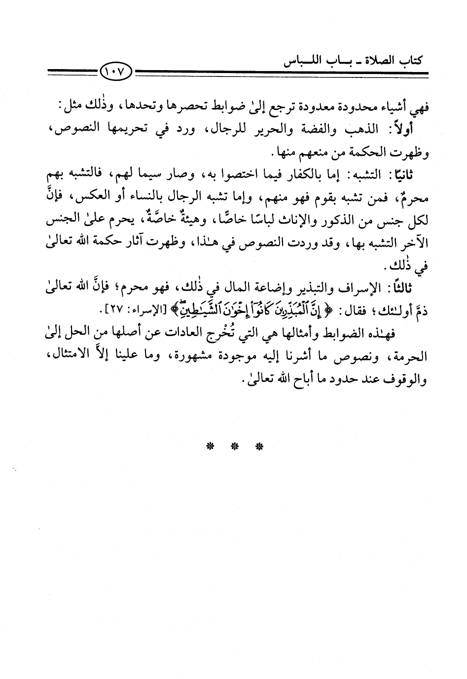 ثانيًا: التشبه: إما بالكفار فيما اختصوا به، وصار سيما لهم، فالتشبه بهم محرمٌ، فمن تشبه بقوم فهو منهم، وإما تشبه الرجال بالنساء أو العكس، فإنَّ لكل جنس من الذكور والإناث لباسًا خاصًّا، وهيئةٌ خاصَّةٌ، يحرم على الجنس الآخر التشبه بها، وقد وردت النصوص في هذا، وظهرت آثار حكمة الله تعالى في ذلك.
