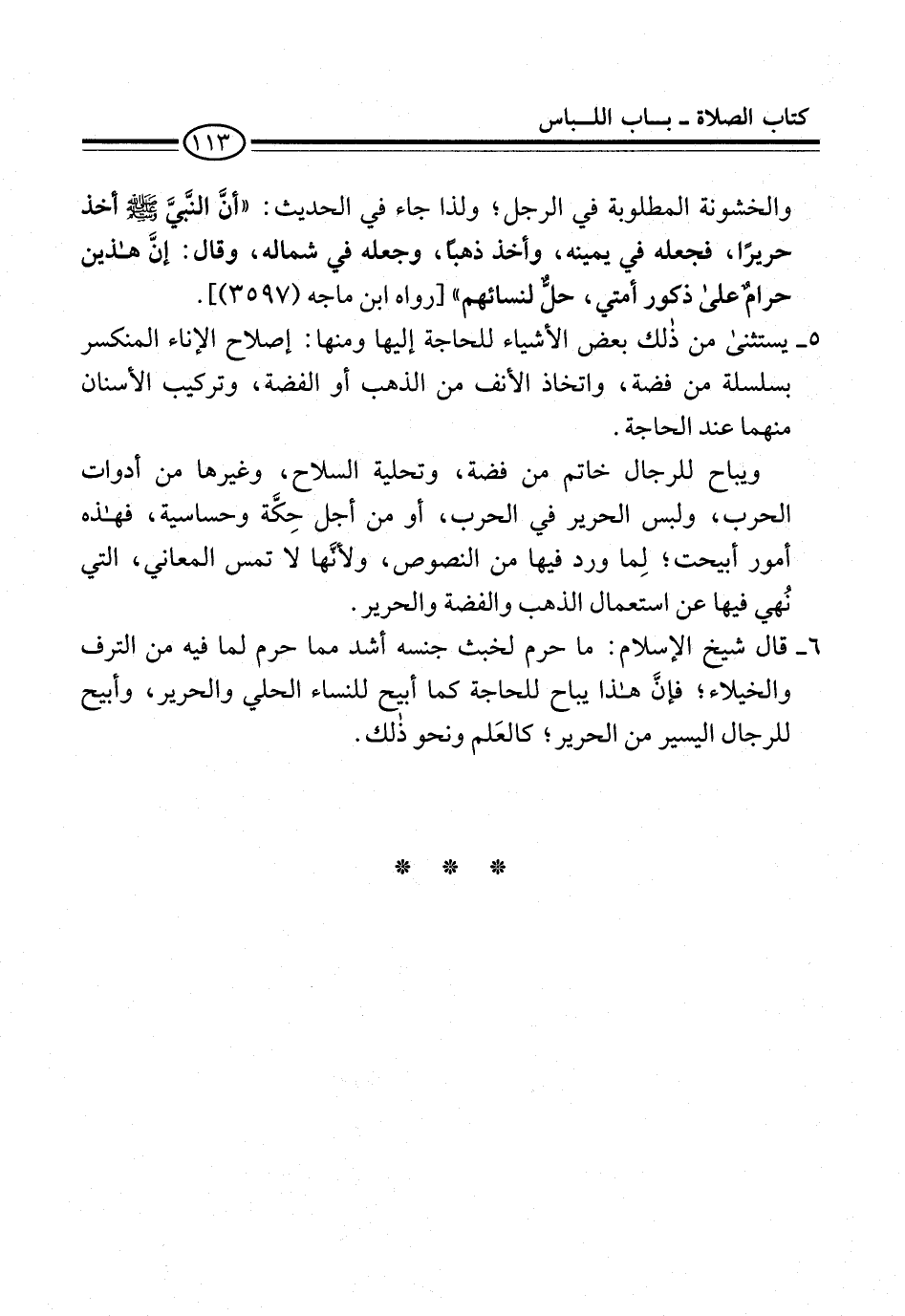 5 - يستثنى من ذلك بعض الأشياء للحاجة إليها ومنها: إصلاح الإناء المنكسر بسلسلة من فضة، واتخاذ الأنف من الذهب أو الفضة، وتركيب الأسنان منهما عند الحاجة.