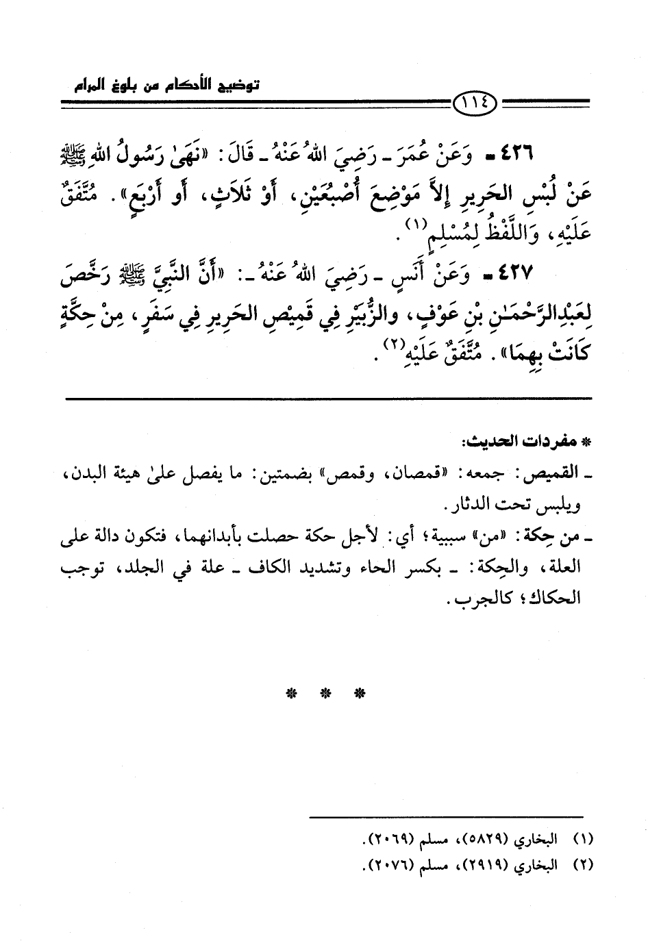 426 - وَعَنْ عُمَرَ -رَضيَ اللهُ عَنْهُ- قَالَ: "نَهَى رَسُولُ اللهِ -صلى الله عليه وسلم- عَنْ لُبْسِ الحَرِيرِ إلاَّ مَوْضِعَ أُصْبُعَيْنِ، أو ثَلاَثٍ، أو أرْبعٍ". مُتَّفَقٌ عَلَيْهِ، وَاللَّفْظُ لِمُسْلِمٍ (¬1).