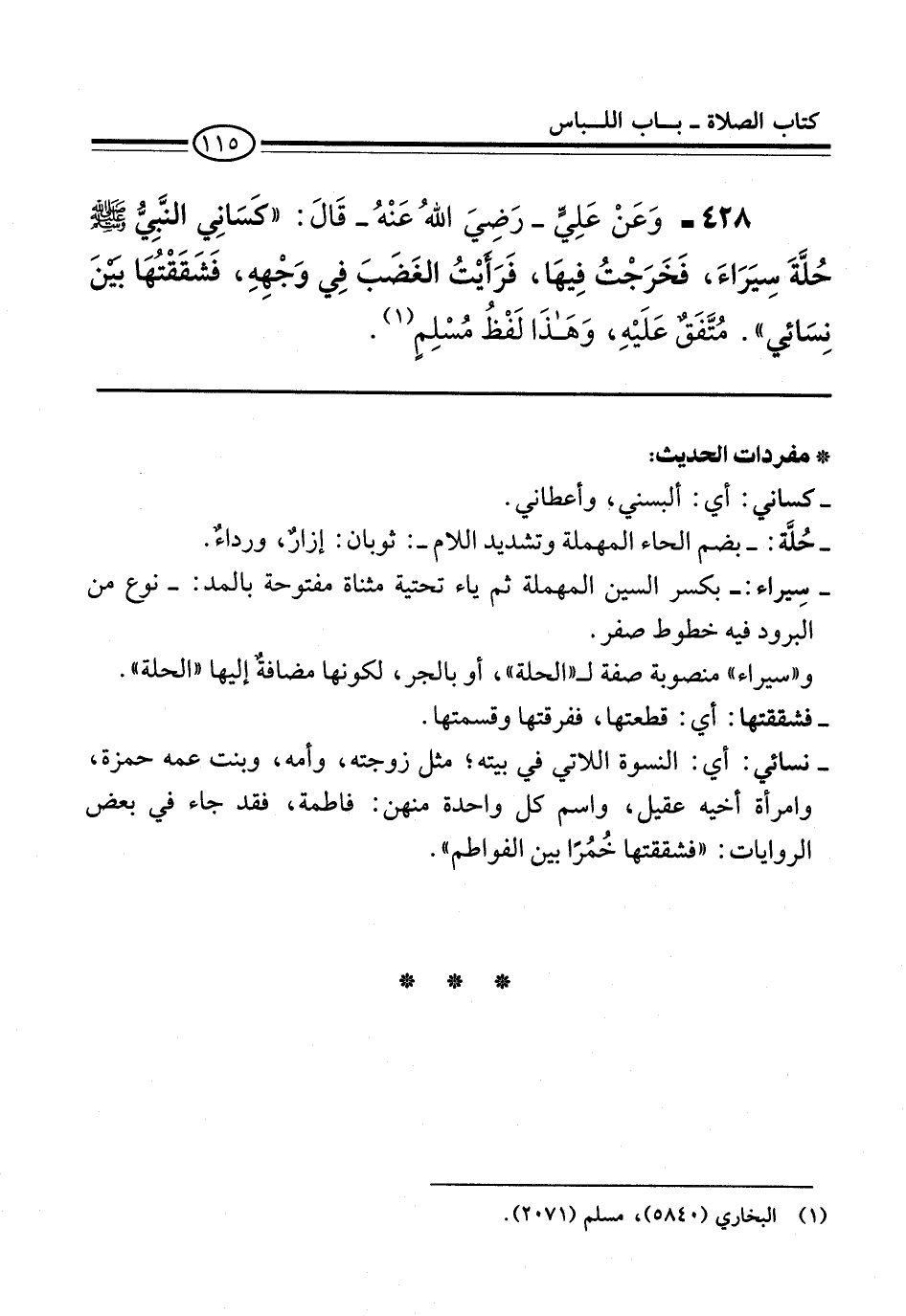 428 - وَعَنْ عَلِىٍّ -رَضِيَ اللهُ عَنْهُ- قَالَ: "كَسَانِي النَّبِيُّ -صلى الله عليه وسلم- حُلَّةَ سِيَرَاءَ، فَخَرَجْتُ فِيهَا، فَرَأيْتُ الغَضَبَ فِي وَجْهِهِ، فَشَقَقْتُهَا بَيْنَ نِسَائي". مُتَّفَقٌ عَلَيْهِ، وَهَذَا لَفْظُ مُسْلِمٍ (¬1).