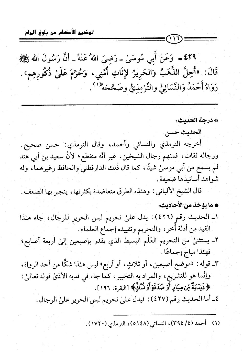 429 - وَعَنْ أَبِي مُوسَى -رَضيَ اللهُ عَنْهُ- أنَّ رَسُولَ الله -صلى الله عليه وسلم- قَالَ: "أُحِلَّ الذَّهَبُ وَالحَرِيرُ لإِنَاثِ أُمَّتِي، وَحُرِّمَ عَلَى ذُكُورِهِم". رَوَاهُ أَحْمَدُ وَالنَّسَائِيُّ والتِّرْمِذِيُّ وصَحَّحَهُ (¬1).