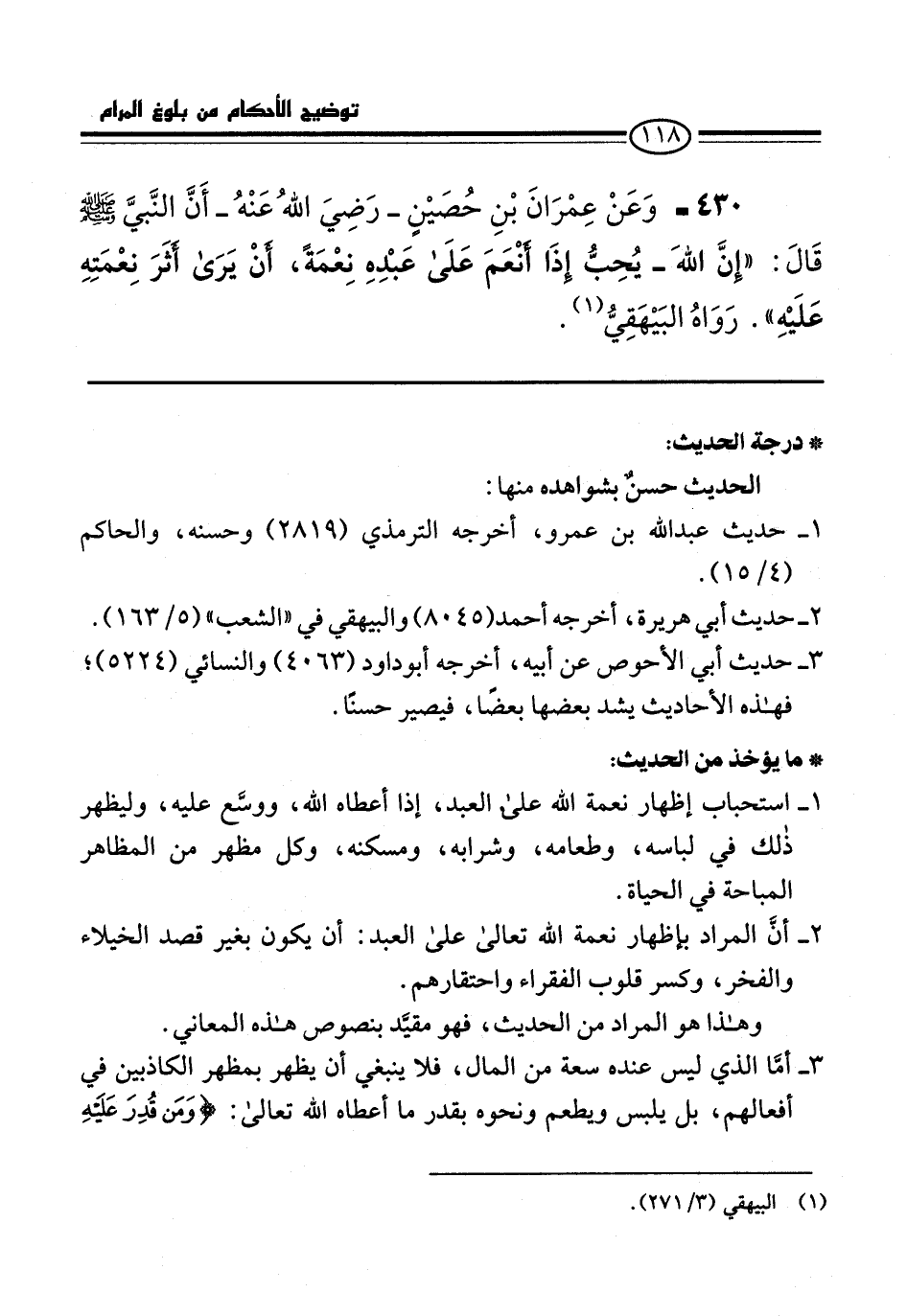 430 - وَعَنْ عِمْرَانَ بْنِ حُصَيْنٍ -رَضِيَ اللهُ عَنْهُ- أَنَّ النَّبيَّ -صلى الله عليه وسلم- قَالَ: "إنَّ اللهَ -يُحِبُّ إِذَا أنْعَمَ عَلَى عَبْدِهِ نِعْمَةً، أنْ يَرَى أثَرَ نِعْمَتِهِ عَلَيْهِ". رَوَاهُ البَيْهَقِيُّ (¬1).