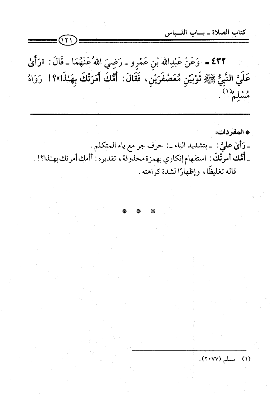 432 - وَعَنْ عَبْدِ الله بْنِ عَمْرو -رَضيَ اللهُ عَنْهُمَا- قَالَ: "رَأَى عَلَيَّ النَّبِيُّ -صلى الله عليه وسلم- ثوْبَينِ مُعَصْفَرَيْنِ، فَقَالَ: أُمُّكَ أمَرَتْكَ بهَذَا"؟! رَوَاهُ مُسْلِمٌ (¬1).
