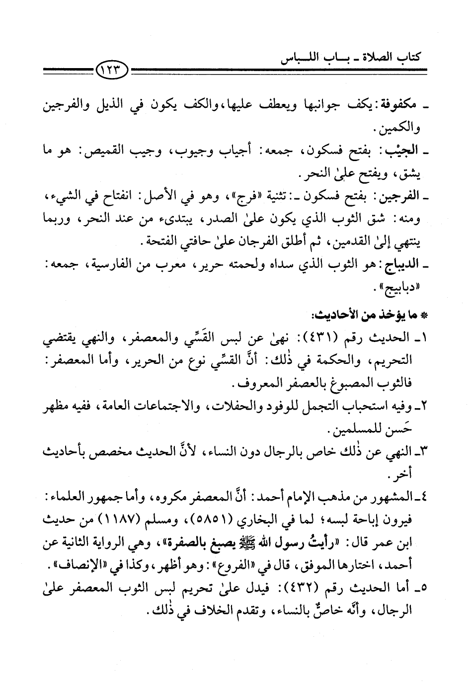 5 - أما الحديث رقم (432): فيدل على تحريم لبس الثوب المعصفر على الرجال، وأنَّه خاصٌّ بالنساء، وتقدم الخلاف في ذلك.