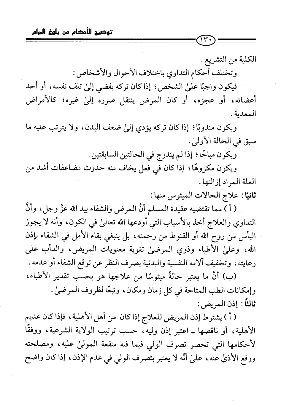 (أ) يشترط إذن المريض للعلاج إذا كان من أهل الأهلية، فإذا كان عديم الأهلية، أو ناقصها -اعتبر إذن وليه، حسب ترتيب الولاية الشرعية، ووفقًا لأحكامها التي تحصر تصرف الولي فيما فيه منفعة المولى عليه، ومصلحته ورفع الأذى عنه، على أنَّه لا يعتبر بتصرف الولي في عدم الإذن، إذا كان واضح